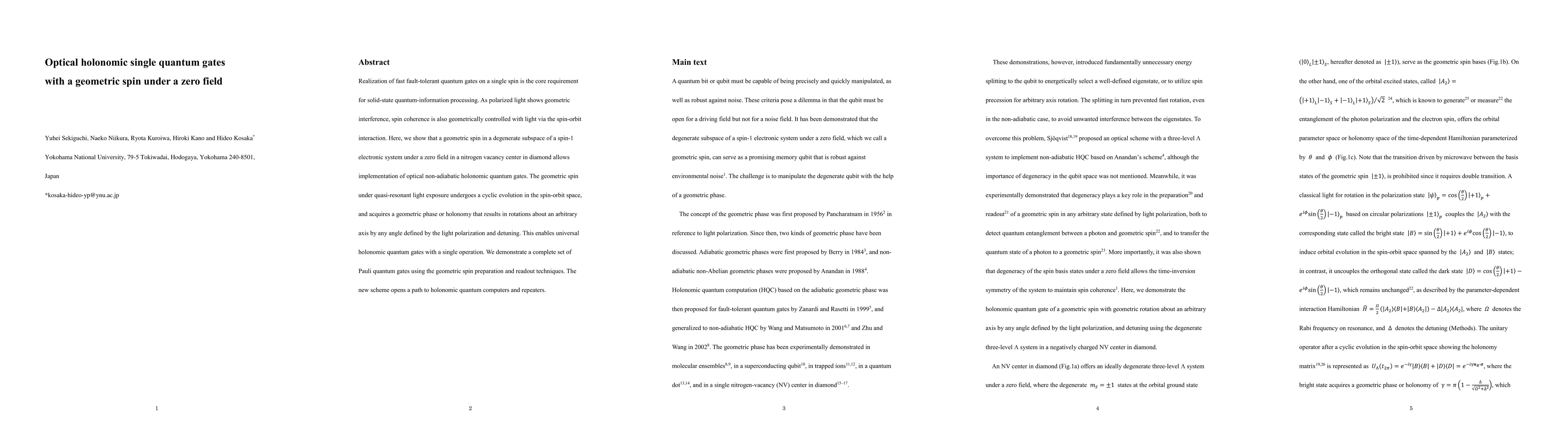 Realization of fast fault-tolerant quantum gates on a single spin is the core requirement for solid-state quantum-information processing. As polarized light shows geometric interference, spin coherence is also geometrically controlled with light via the spin-orbit interaction. Here, we show that a geometric spin in a degenerate subspace of a spin-1 electronic system under a zero field in a nitrogen vacancy center in diamond allows implementation of optical non-adiabatic holonomic quantum gates. The geometric spin under quasi-resonant light exposure undergoes a cyclic evolution in the spin-orbit space, and acquires a geometric phase or holonomy that results in rotations about an arbitrary axis by any angle defined by the light polarization and detuning. This enables universal holonomic quantum gates with a single operation. We demonstrate a complete set of Pauli quantum gates using the geometric spin preparation and readout techniques. The new scheme opens a path to holonomic quantum computers and repeaters.