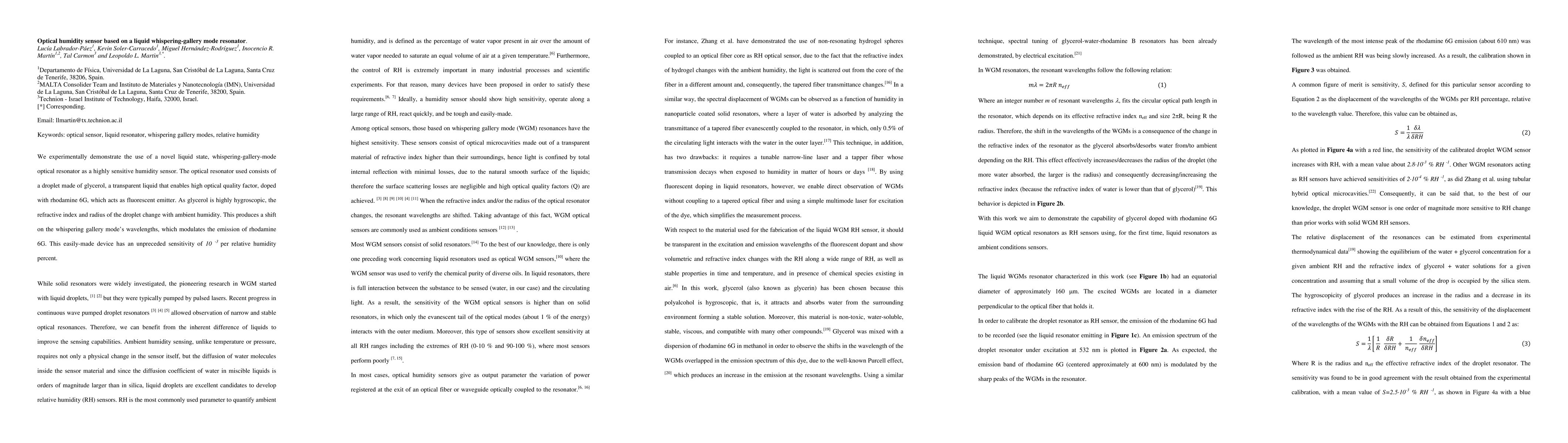 This paper demonstrates a highly sensitive optical humidity sensor using a glycerol droplet-based whispering-gallery mode resonator doped with rhodamine 6G, showing a shift in resonant wavelengths with ambient humidity that modulates fluorescence emission, achieving unprecedented sensitivity of 10^-3 per relative humidity percent.