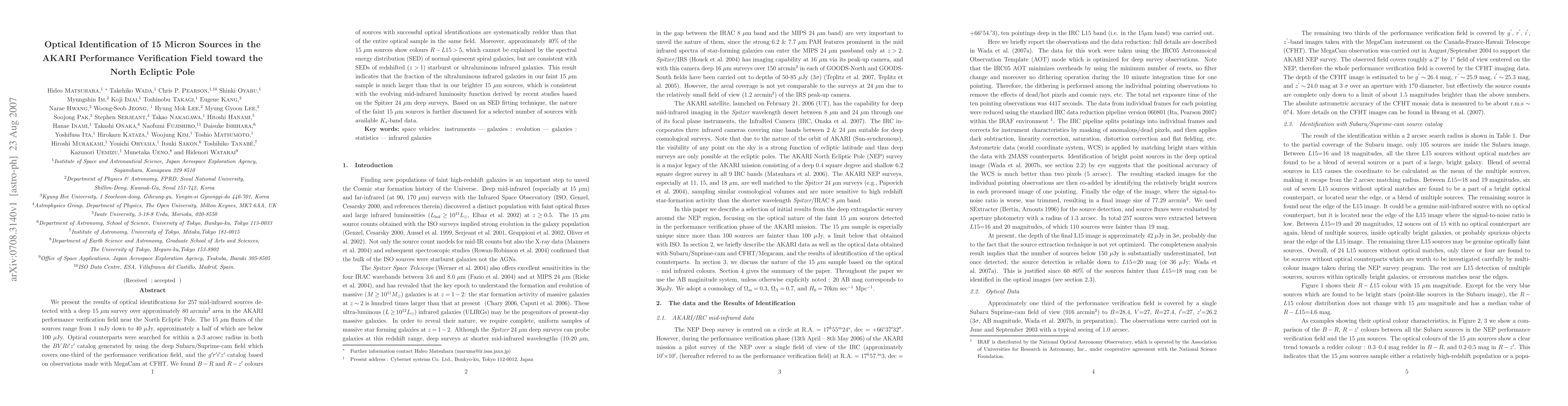 This paper reports optical identifications for 257 mid-infrared sources detected at 15 microns in the AKARI field near the North Ecliptic Pole, finding that about 40% exhibit colors indicative of redshifted starburst or ultraluminous infrared galaxies, suggesting a higher fraction of such galaxies in faint 15 micron samples compared to brighter ones.