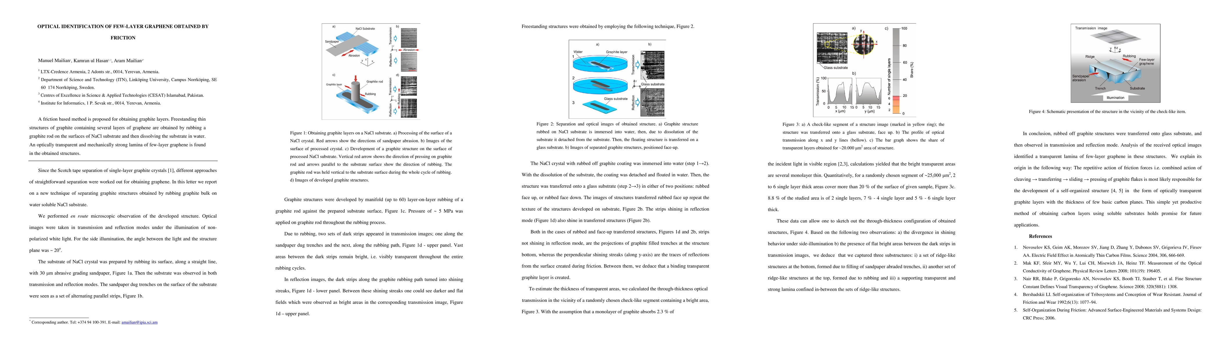 This paper proposes a friction-based method to obtain few-layer graphene by rubbing a graphite rod on a NaCl substrate, followed by dissolving the substrate in water, resulting in optically transparent and mechanically strong graphene lamina.