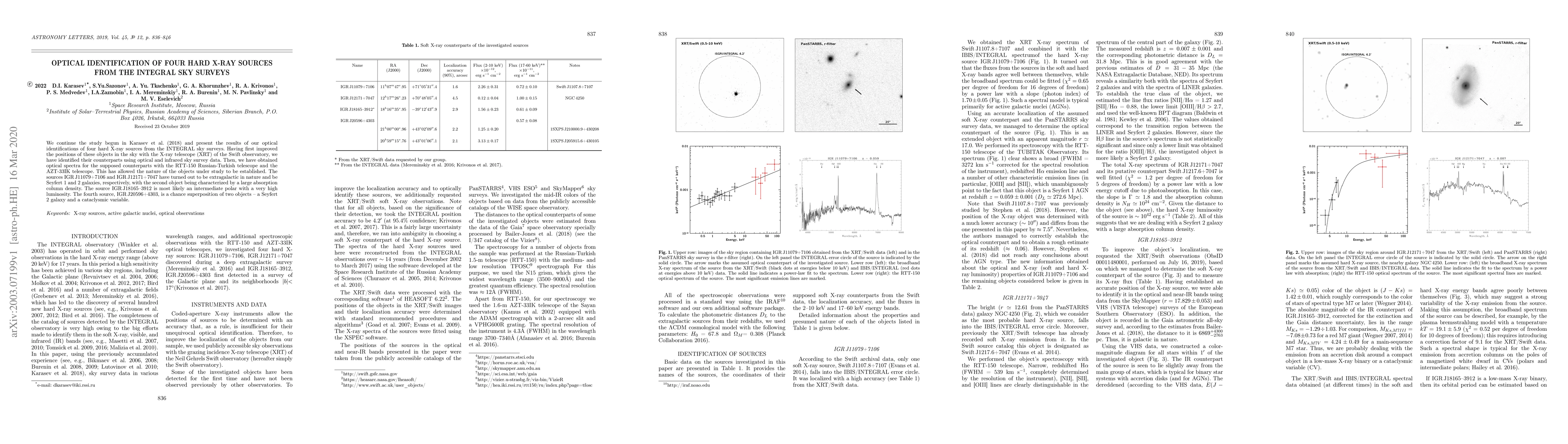 This study identifies four hard X-ray sources from INTEGRAL sky surveys using improved Swift X-ray telescope positions and optical/infrared data, revealing two Seyfert galaxies, an intermediate polar, and a superposition of a Seyfert 2 and a cataclysmic variable.
