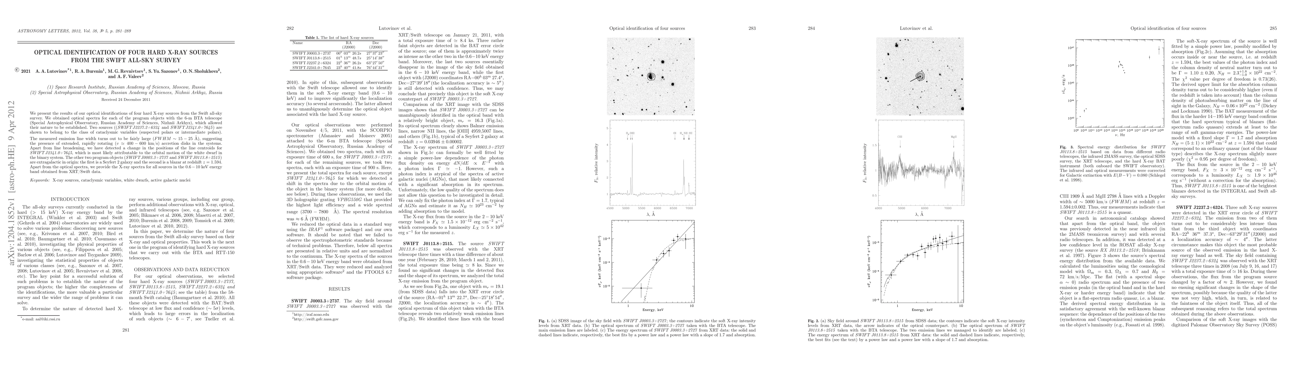 This paper identifies four hard X-ray sources from the Swift all-sky survey through optical spectra obtained with the 6-m BTA telescope, revealing two cataclysmic variables and two extragalactic objects: a Seyfert 2 galaxy and a blazar. The study highlights significant emission line broadening and orbital motion in one of the binary systems.