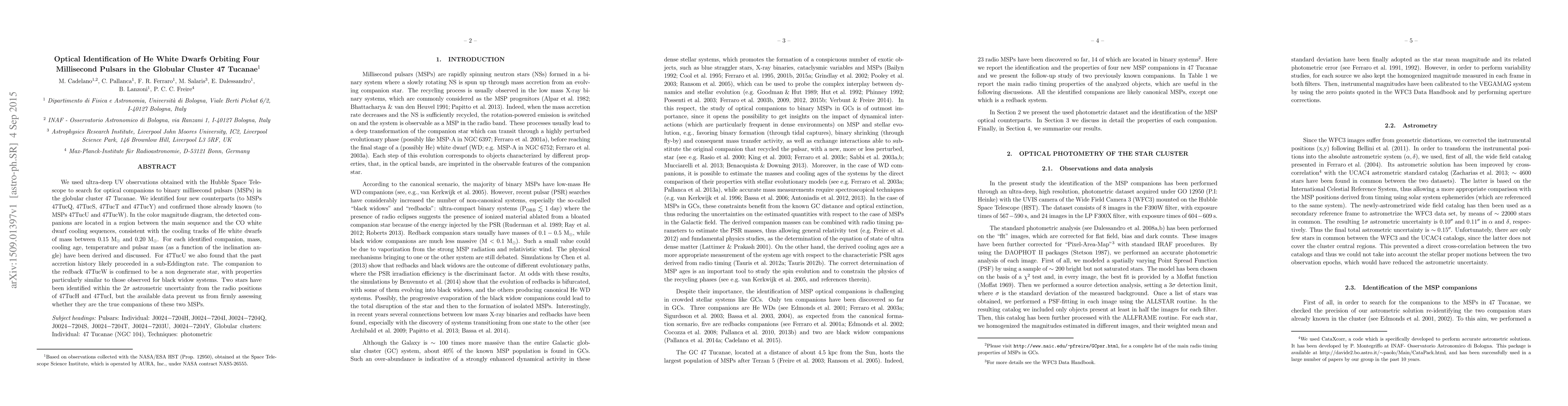 This study identifies optical companions to four millisecond pulsars in the globular cluster 47 Tucanae using Hubble Space Telescope observations, confirming known companions and discovering new ones. The companions are identified as He white dwarfs with masses between 0.15 and 0.20 Msun, and detailed properties such as mass, cooling age, and temperature have been derived.