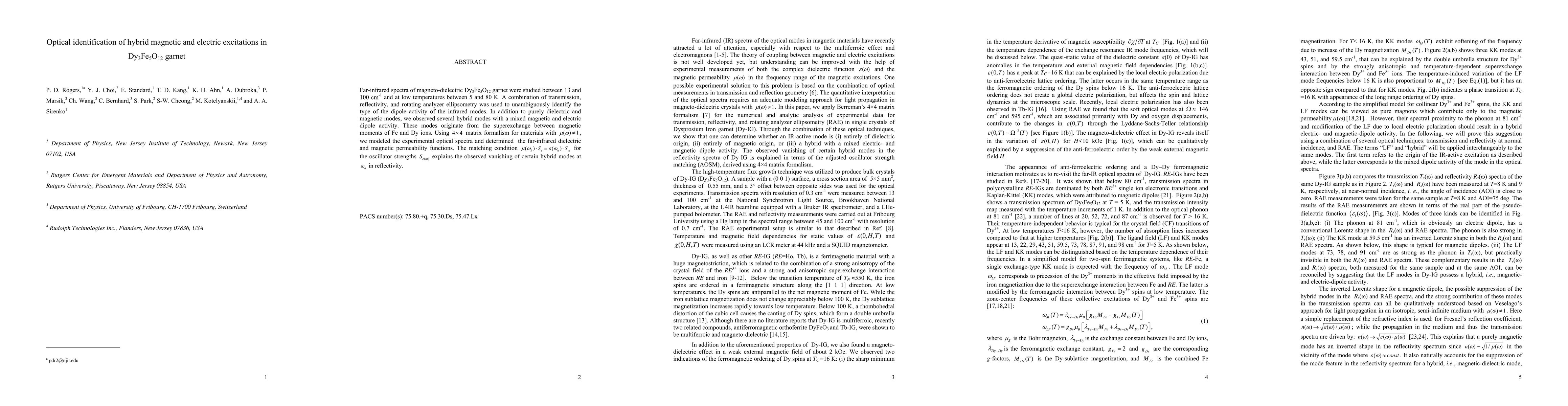 Far-infrared spectra of magneto-dielectric Dy3Fe5O12 garnet were studied between 13 and 100 cm-1 and at low temperatures between 5 and 80 K. A combination of transmission, reflectivity, and rotating analyzer ellipsometry was used to unambiguously identify the type of the dipole activity of the infrared modes. In addition to purely dielectric and magnetic modes, we observed several hybrid modes with a mixed magnetic and electric dipole activity. These modes originate from the superexchange between magnetic moments of Fe and Dy ions. Using 4x4 matrix formalism for materials with Mu=/=1, we modeled the experimental optical spectra and determined the far-infrared dielectric and magnetic permeability functions. The matching condition Mu(Wh)*Se=Eps(Wh)*Sm for the oscillator strengths Se(m) explains the observed vanishing of certain hybrid modes at Wh in reflectivity.