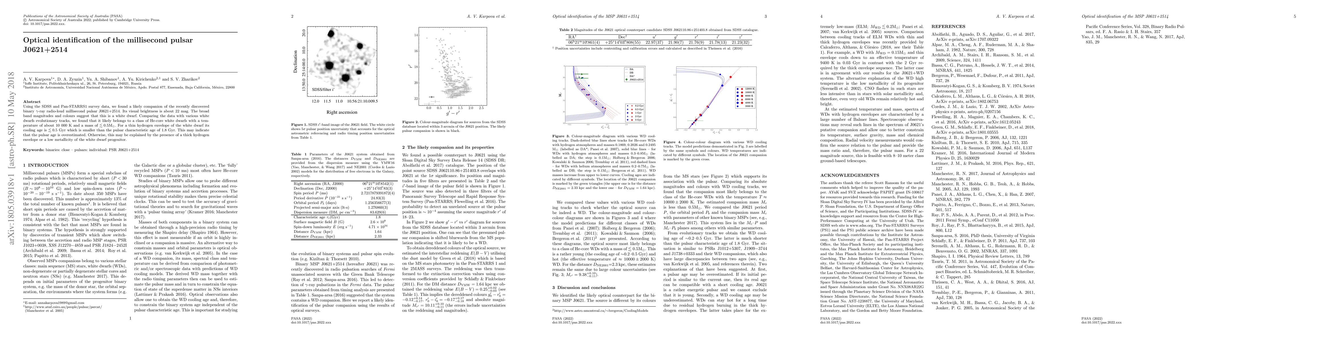 Using the SDSS and Pan-STARRS1 survey data, we found a likely companion of the recently discovered binary $\gamma$-ray radio-loud millisecond pulsar J0621+2514. Its visual brightness is about 22 mag. The broad band magnitudes and colours suggest that this is a white dwarf. Comparing the data with various white dwarfs evolutionary tracks, we found that it likely belongs to a class of He-core white dwarfs with a temperature of about 10 000 K and a mass of $\lesssim 0.5$M$_\odot$. For a thin hydrogen envelope of the white dwarf its cooling age is $\lesssim0.5$ Gyr which is smaller than the pulsar characteristic age of 1.8 Gyr. This may indicate that the pulsar age is overestimated. Otherwise, this may be explained by the presence of a thick hydrogen envelope or a low metallicity of the white dwarf progenitor.