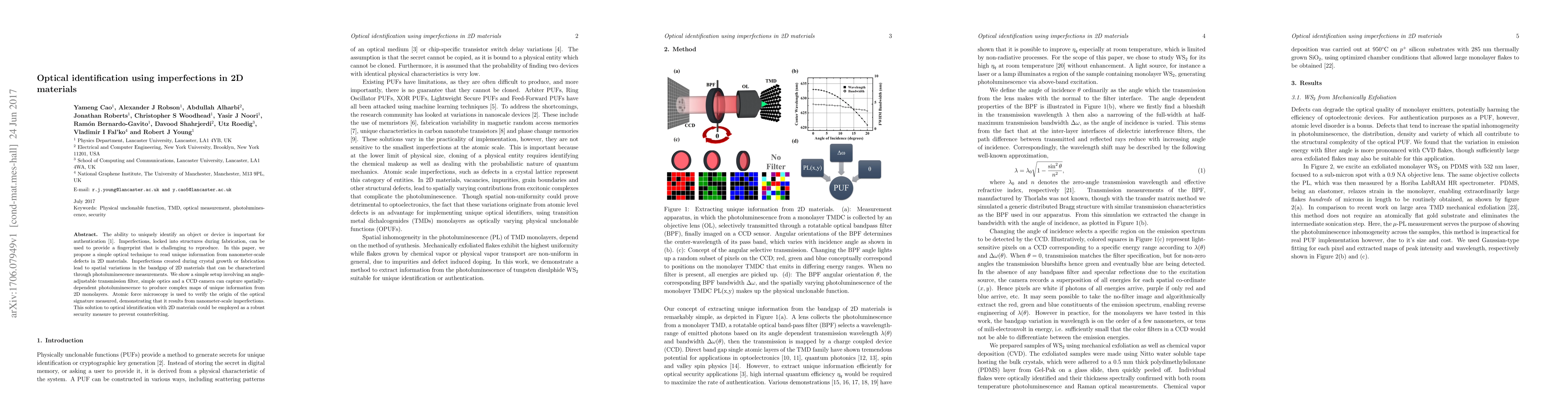 The ability to uniquely identify an object or device is important for authentication. Imperfections, locked into structures during fabrication, can be used to provide a fingerprint that is challenging to reproduce. In this paper, we propose a simple optical technique to read unique information from nanometer-scale defects in 2D materials. Flaws created during crystal growth or fabrication lead to spatial variations in the bandgap of 2D materials that can be characterized through photoluminescence measurements. We show a simple setup involving an angle-adjustable transmission filter, simple optics and a CCD camera can capture spatially-dependent photoluminescence to produce complex maps of unique information from 2D monolayers. Atomic force microscopy is used to verify the origin of the optical signature measured, demonstrating that it results from nanometer-scale imperfections. This solution to optical identification with 2D materials could be employed as a robust security measure to prevent counterfeiting.