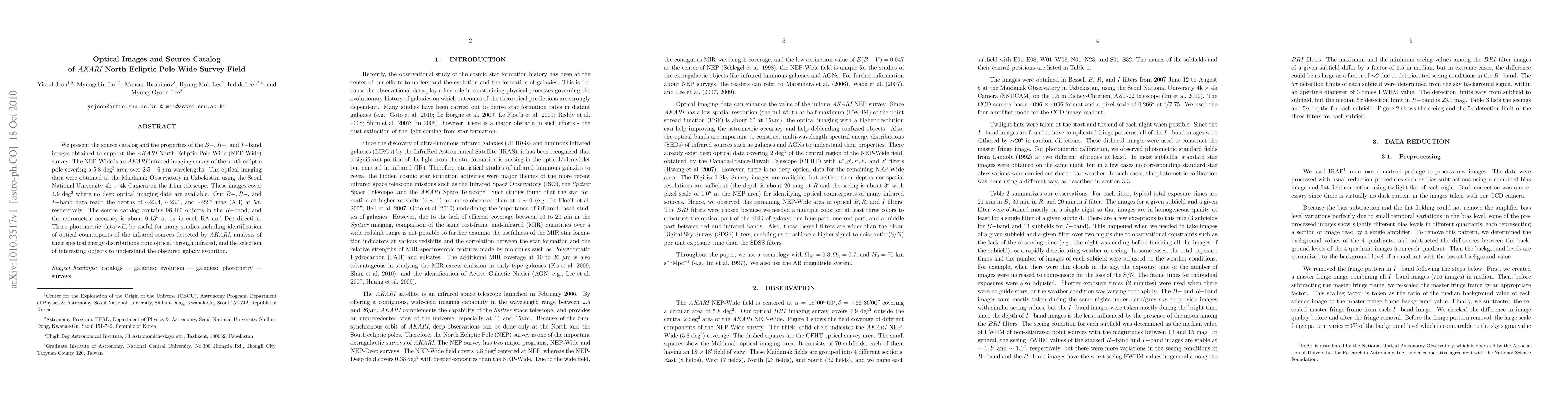This paper presents a source catalog and optical $B-, R-$, and $I-$band images from the AKARI North Ecliptic Pole Wide survey, providing deep imaging data over a 4.9 deg$^2$ area. The catalog includes 96,460 objects with high astrometric accuracy, supporting studies on infrared source identification and galaxy evolution.