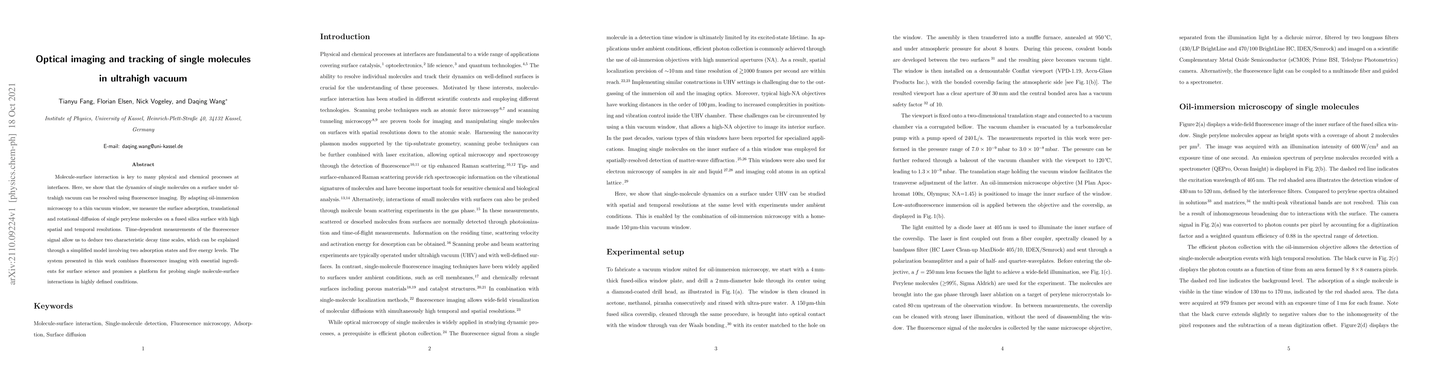 Molecule-surface interaction is key to many physical and chemical processes at interfaces. Here, we show that the dynamics of single molecules on a surface under ultrahigh vacuum can be resolved using fluorescence imaging. By adapting oil-immersion microscopy to a thin vacuum window, we measure the surface adsorption, translational and rotational diffusion of single perylene molecules on a fused silica surface with high spatial and temporal resolutions. Time-dependent measurements of the fluorescence signal allow us to deduce two characteristic decay time scales, which can be explained through a simplified model involving two adsorption states and five energy levels. The system presented in this work combines fluorescence imaging with essential ingredients for surface science and promises a platform for probing single molecule-surface interactions in highly defined conditions.