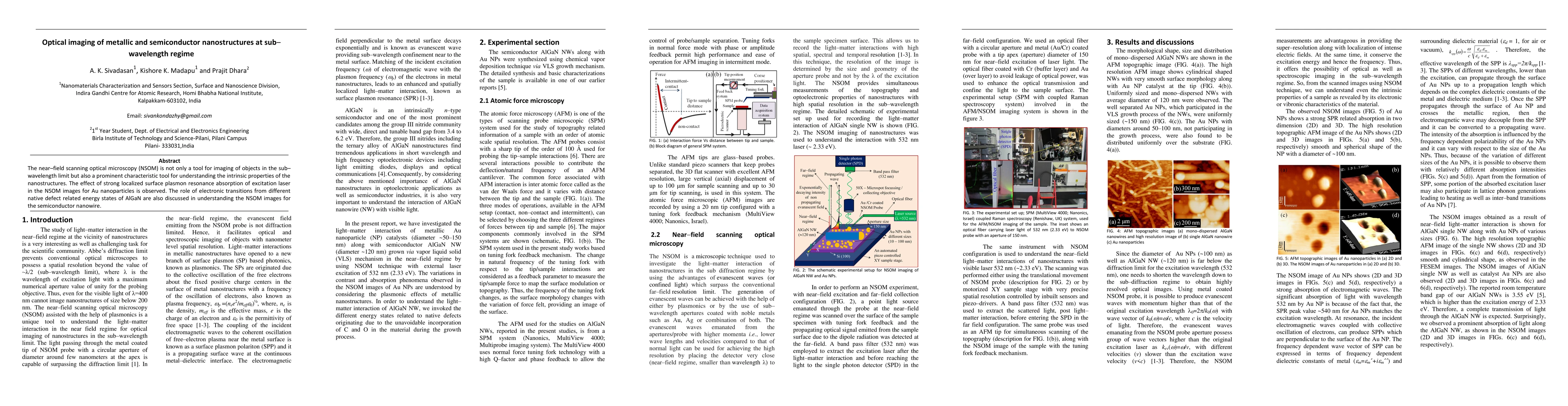 Summary: This paper utilizes near field scanning optical microscopy (NSOM) to image metallic and semiconductor nanostructures at sub-wavelength limits, revealing the localized surface plasmon resonance in Au nanoparticles and electronic transitions in AlGaN nanowires, thereby providing insights into their intrinsic properties.