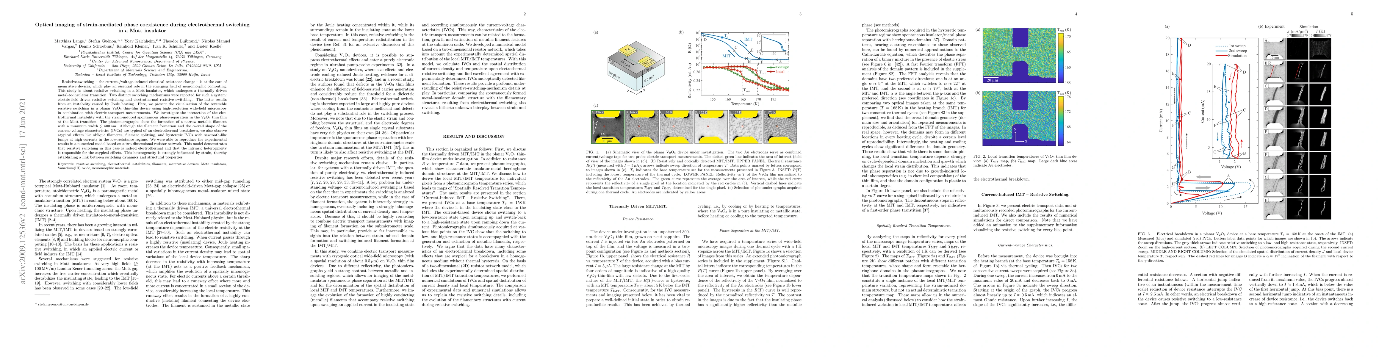 Resistive-switching -- the current-/voltage-induced electrical resistance change -- is at the core of memristive devices, which play an essential role in the emerging field of neuromorphic computing. This study is about resistive switching in a Mott-insulator, which undergoes a thermally driven metal-to-insulator transition. Two distinct switching mechanisms were reported for such a system: electric-field-driven resistive switching and electrothermal resistive switching. The latter results from an instability caused by Joule heating. Here, we present the visualization of the reversible resistive switching in a planar V$_2$O$_3$ thin-film device using high-resolution wide-field microscopy in combination with electric transport measurements. We investigate the interaction of the electrothermal instability with the strain-induced spontaneous phase-separation in the V$_2$O$_3$ thin film at the Mott-transition. The photomicrographs show the formation of a narrow metallic filament with a minimum width $\lesssim$ 500\,nm. Although the filament formation and the overall shape of the current-voltage characteristics (IVCs) are typical of an electrothermal breakdown, we also observe atypical effects like oblique filaments, filament splitting, and hysteretic IVCs with sawtooth-like jumps at high currents in the low-resistance regime. We were able to reproduce the experimental results in a numerical model based on a two-dimensional resistor network. This model demonstrates that resistive switching, in this case, is indeed electrothermal and that the intrinsic heterogeneity is responsible for the atypical effects. This heterogeneity is strongly influenced by strain, thereby establishing a link between switching dynamics and structural properties.