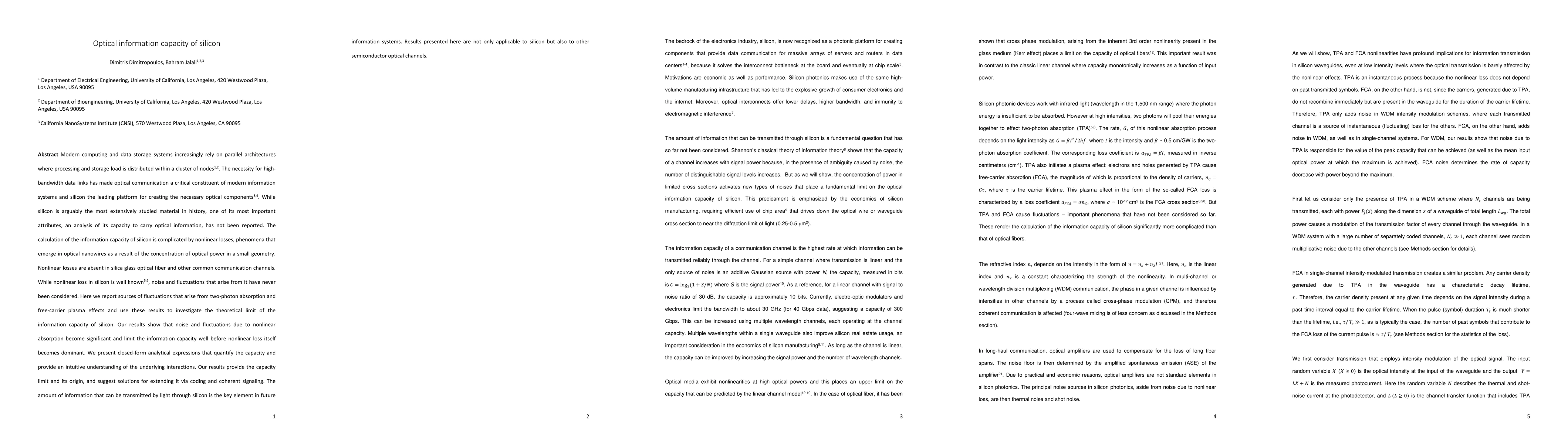 This paper investigates the theoretical limit of optical information capacity in silicon, revealing that noise and fluctuations from nonlinear absorption significantly limit capacity before nonlinear loss becomes dominant. The study provides analytical expressions for this capacity and suggests potential solutions via coding and coherent signaling.