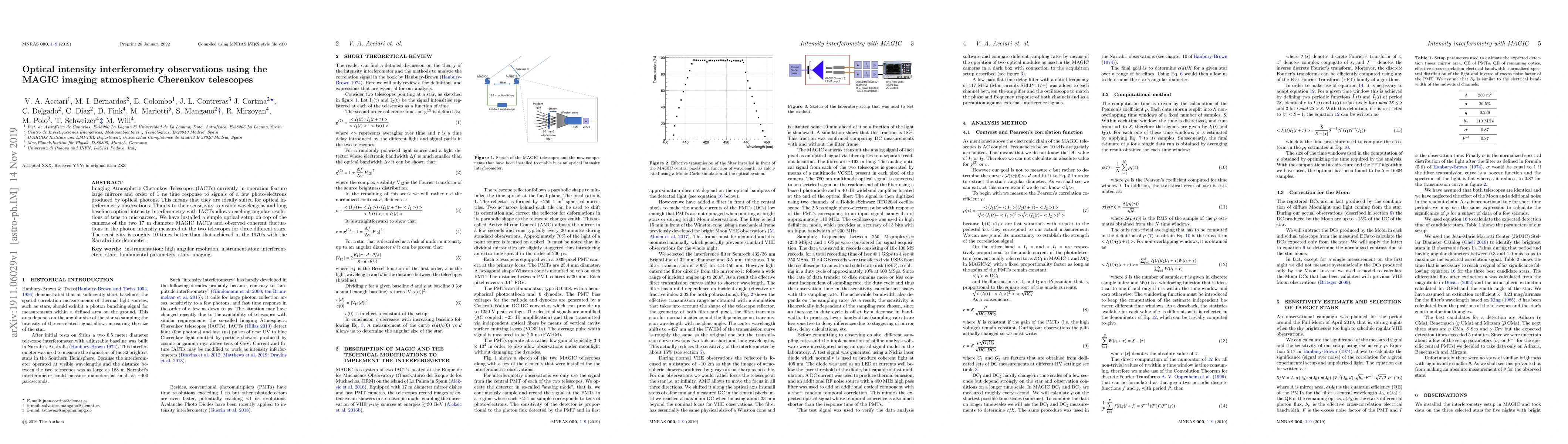This study employs MAGIC IACTs to perform optical intensity interferometry, achieving angular resolutions of tens to microarcsec. The setup on MAGIC telescopes detected coherent intensity fluctuations for three stars, demonstrating a sensitivity improvement of about 10 times over the 1970s Narrabri interferometer.
