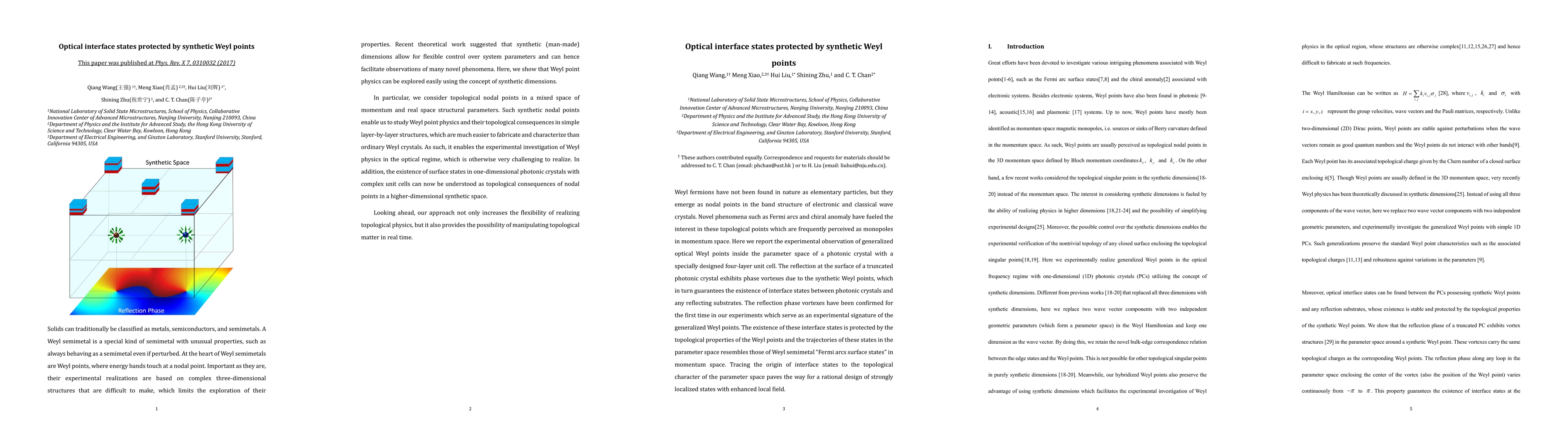 This paper reports the experimental observation of synthetic Weyl points in a photonic crystal, leading to the emergence of topologically protected interface states. The study confirms phase vortexes in reflection, demonstrating the topological nature of these Weyl points and their potential for creating strongly localized states.