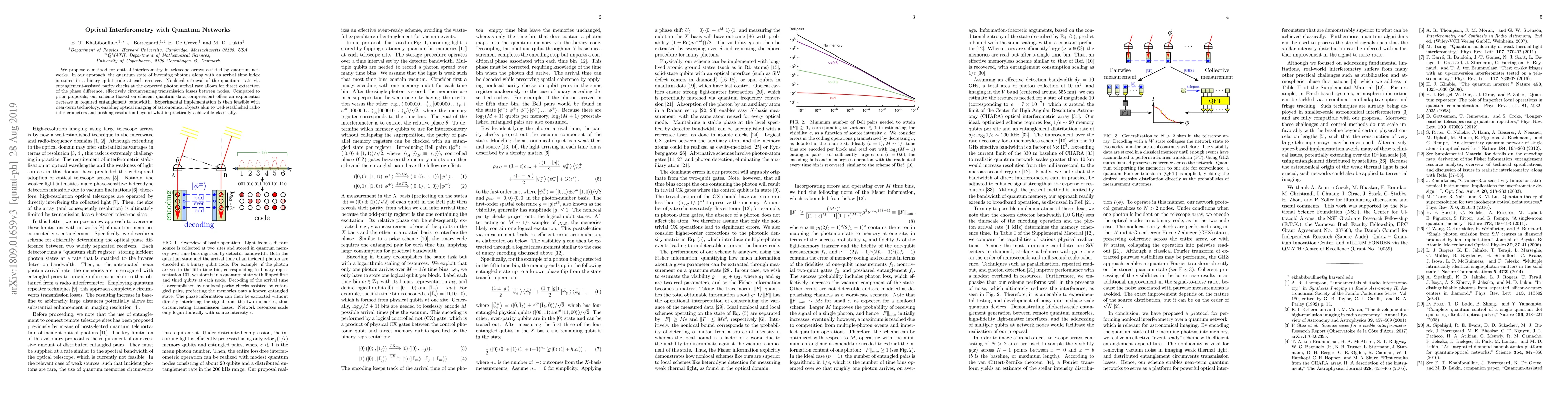 Researchers propose a new method for optical interferometry using quantum networks, enabling improved resolution and reduced transmission losses. This approach uses entanglement-assisted parity checks to extract phase differences from incoming photons.