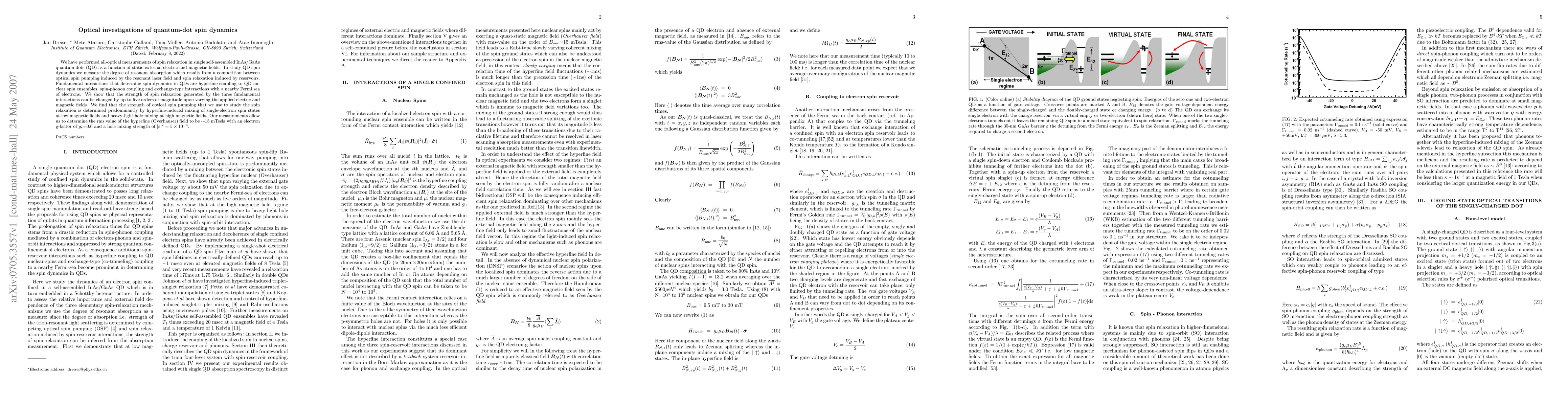 We have performed all-optical measurements of spin relaxation in single self-assembled InAs/GaAs quantum dots (QD) as a function of static external electric and magnetic fields. To study QD spin dynamics we measure the degree of resonant absorption which results from a competition between optical spin pumping induced by the resonant laser field and spin relaxation induced by reservoirs. Fundamental interactions that determine spin dynamics in QDs are hyperfine coupling to QD nuclear spin ensembles, spin-phonon coupling and exchange-type interactions with a nearby Fermi sea of electrons. We show that the strength of spin relaxation generated by the three fundamental interactions can be changed by up to five orders of magnitude upon varying the applied electric and magnetic fields. We find that the strength of optical spin pumping that we use to study the spin relaxation is determined predominantly by hyperfine-induced mixing of single-electron spin states at low magnetic fields and heavy-light hole mixing at high magnetic fields. Our measurements allow us to determine the rms value of the hyperfine (Overhauser) field to be ~15 mTesla with an electron g-factor of g_e=0.6 and a hole mixing strength of |epsilon|^2 = 0.0005.