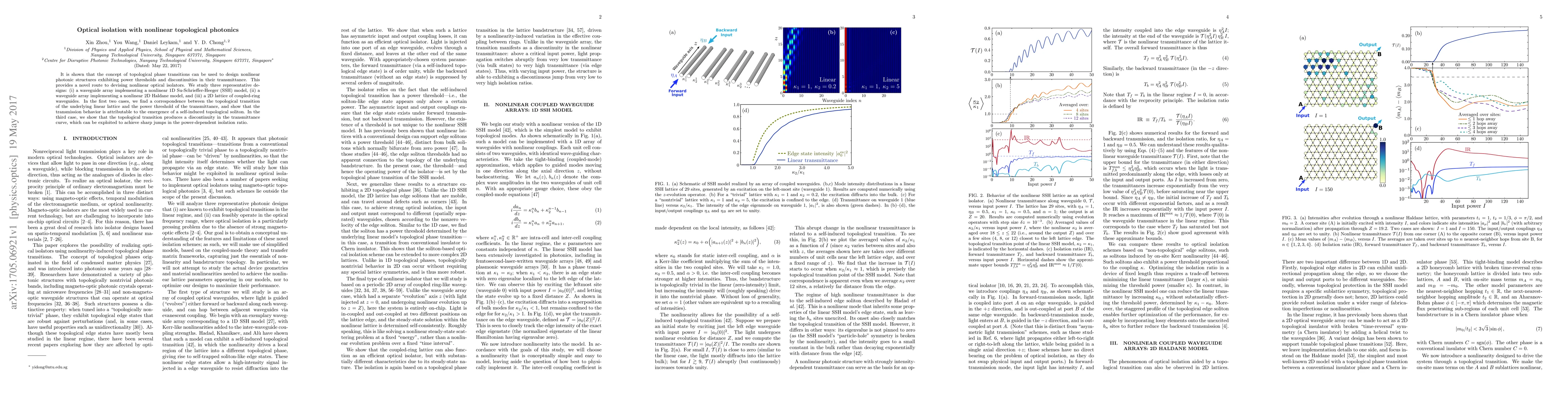 It is shown that the concept of topological phase transitions can be used to design nonlinear photonic structures exhibiting power thresholds and discontinuities in their transmittance. This provides a novel route to devising nonlinear optical isolators. We study three representative designs: (i) a waveguide array implementing a nonlinear 1D Su-Schrieffer-Heeger (SSH) model, (ii) a waveguide array implementing a nonlinear 2D Haldane model, and (iii) a 2D lattice of coupled-ring waveguides. In the first two cases, we find a correspondence between the topological transition of the underlying linear lattice and the power threshold of the transmittance, and show that the transmission behavior is attributable to the emergence of a self-induced topological soliton. In the third case, we show that the topological transition produces a discontinuity in the transmittance curve, which can be exploited to achieve sharp jumps in the power-dependent isolation ratio.