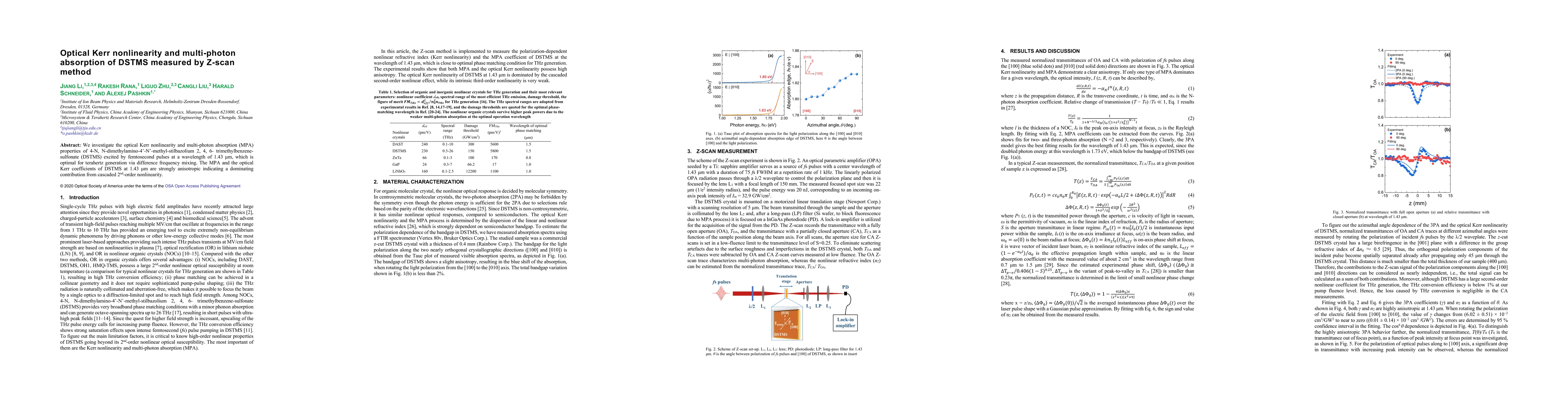 This study investigates the optical Kerr nonlinearity and multi-photon absorption properties of DSTMS using femtosecond pulses at 1.43 μm, revealing strong anisotropy and dominance of cascaded 2nd-order nonlinearity. The findings suggest that MPA and spectral broadening due to cascaded frequency mixing significantly impact the saturation of terahertz generation efficiency.