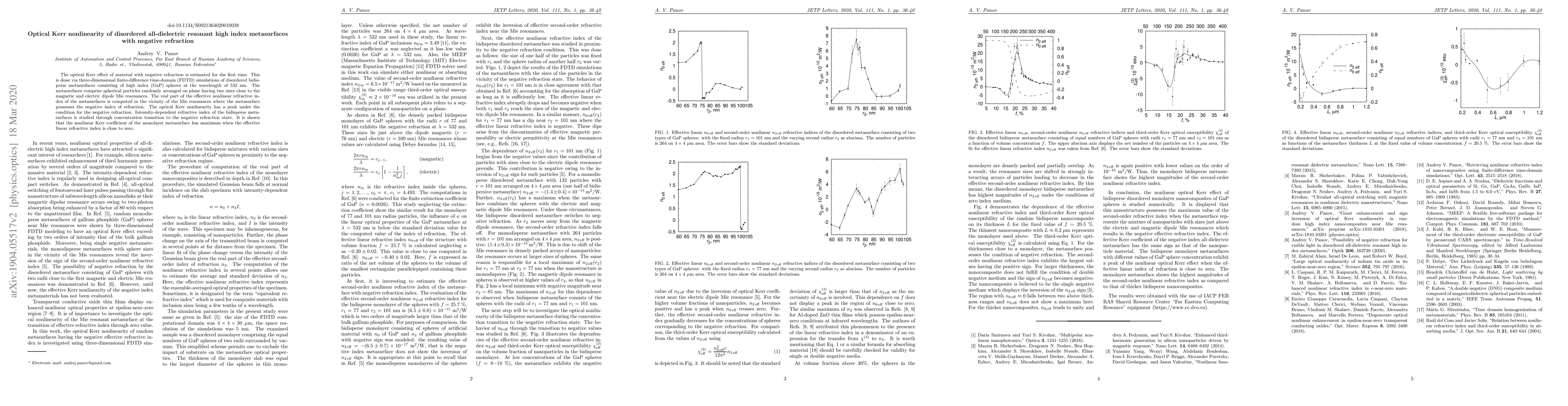 This paper investigates the optical Kerr effect in disordered all-dielectric metasurfaces made of high-index GaP spheres, revealing a peak in optical Kerr nonlinearity near negative refraction conditions. The study uses FDTD simulations to compute the effective nonlinear refractive index, showing maximum nonlinearity when the linear refractive index is near zero.