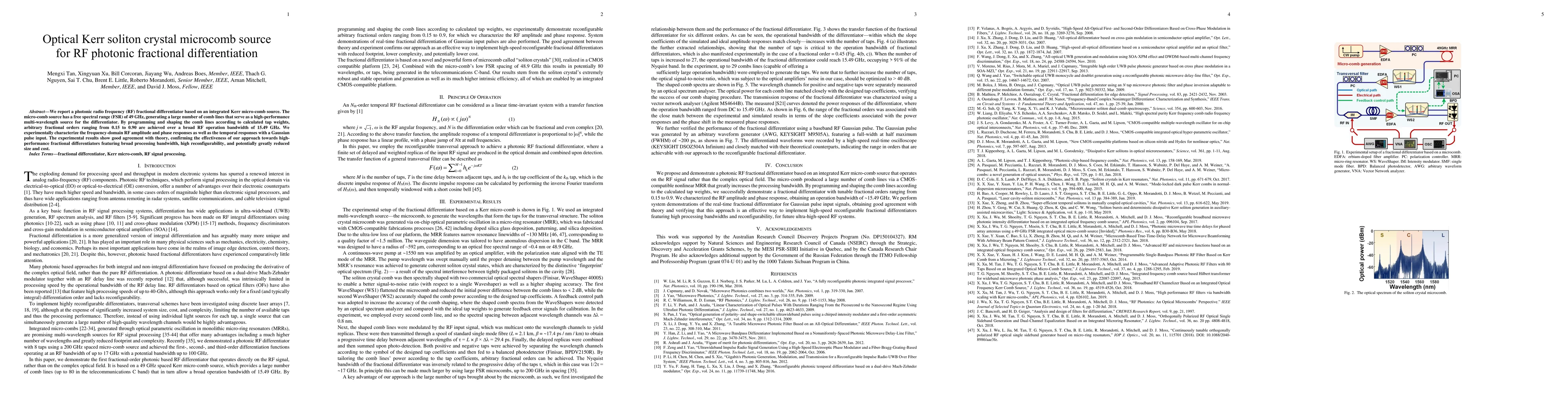 This research develops a photonic RF fractional differentiator using a Kerr soliton micro-comb source, achieving fractional orders from 0.15 to 0.90 across a 15.49 GHz bandwidth. Experimental validation demonstrates high performance, reconfigurability, and potential size/cost reductions.