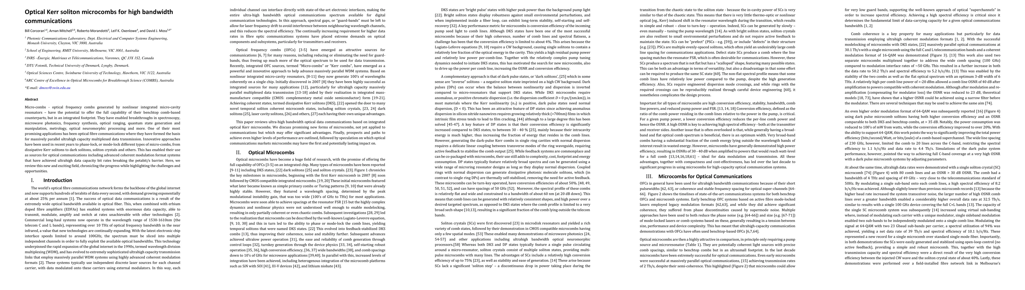 The paper reviews the progress in the field of microcombs, specifically those generated by nonlinear integrated micro-cavity resonators, focusing on their applications in optical fiber communications.