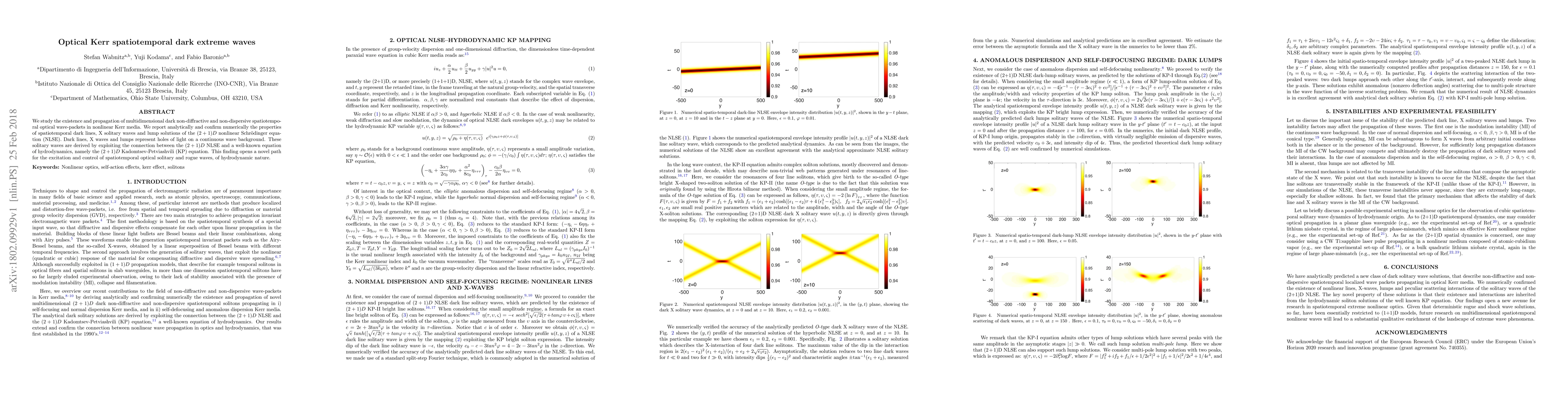 This paper investigates the existence and behavior of dark spatiotemporal optical wave-packets in nonlinear Kerr media, revealing analytically and numerically the properties of dark lines, X solitary waves, and lump solutions in the (2 + 1)D nonlinear Schrödinger equation. These findings link optical phenomena to hydrodynamic equations, offering new methods for controlling spatiotemporal optical solitary and rogue waves.