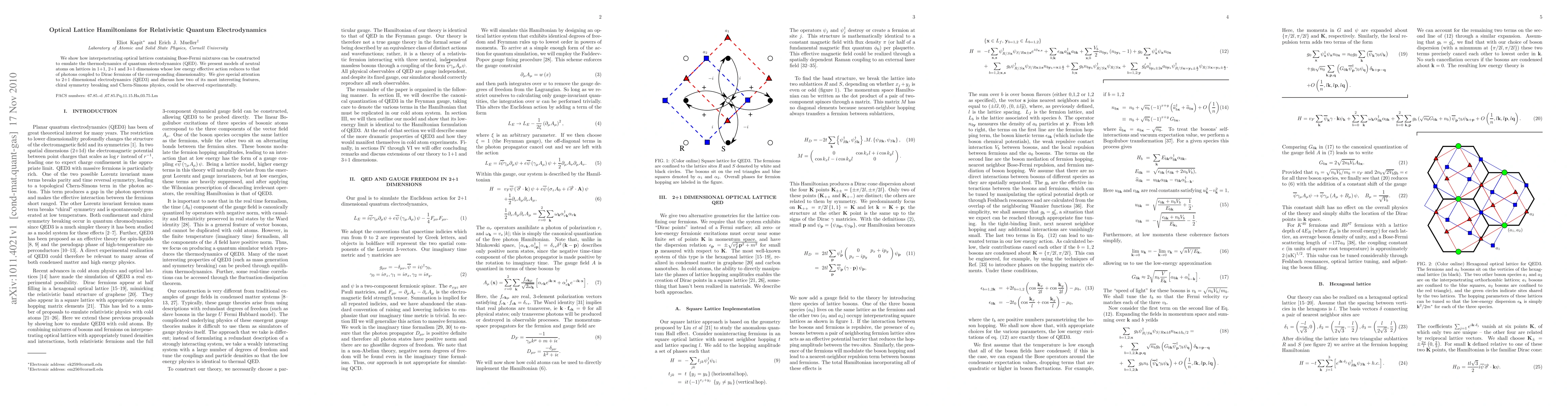 We show how interpenetrating optical lattices containing Bose-Fermi mixtures can be constructed to emulate the thermodynamics of quantum electrodynamics (QED). We present models of neutral atoms on lattices in 1+1, 2+1 and 3+1 dimensions whose low energy effective action reduces to that of photons coupled to Dirac fermions of the corresponding dimensionality. We give special attention to 2+1 dimensional electrodynamics (QED3) and discuss how two of its most interesting features, chiral symmetry breaking and Chern-Simons physics, could be observed experimentally.