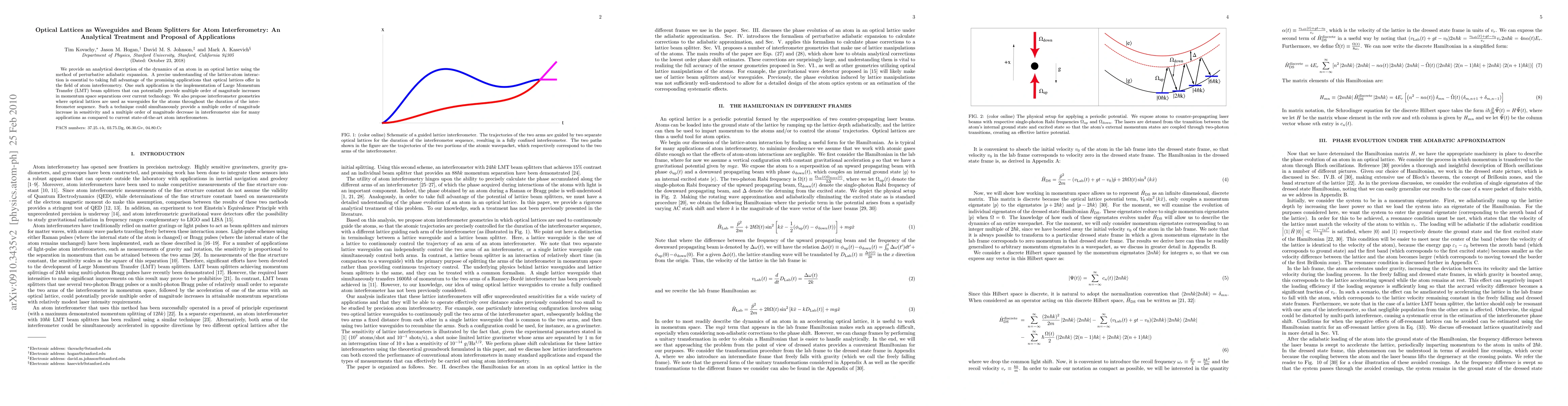 We provide an analytical description of the dynamics of an atom in an optical lattice using the method of perturbative adiabatic expansion. A precise understanding of the lattice-atom interaction is essential to taking full advantage of the promising applications that optical lattices offer in the field of atom interferometry. One such application is the implementation of Large Momentum Transfer (LMT) beam splitters that can potentially provide multiple order of magnitude increases in momentum space separations over current technology. We also propose interferometer geometries where optical lattices are used as waveguides for the atoms throughout the duration of the interferometer sequence. Such a technique could simultaneously provide a multiple order of magnitude increase in sensitivity and a multiple order of magnitude decrease in interferometer size for many applications as compared to current state-of-the-art atom interferometers.