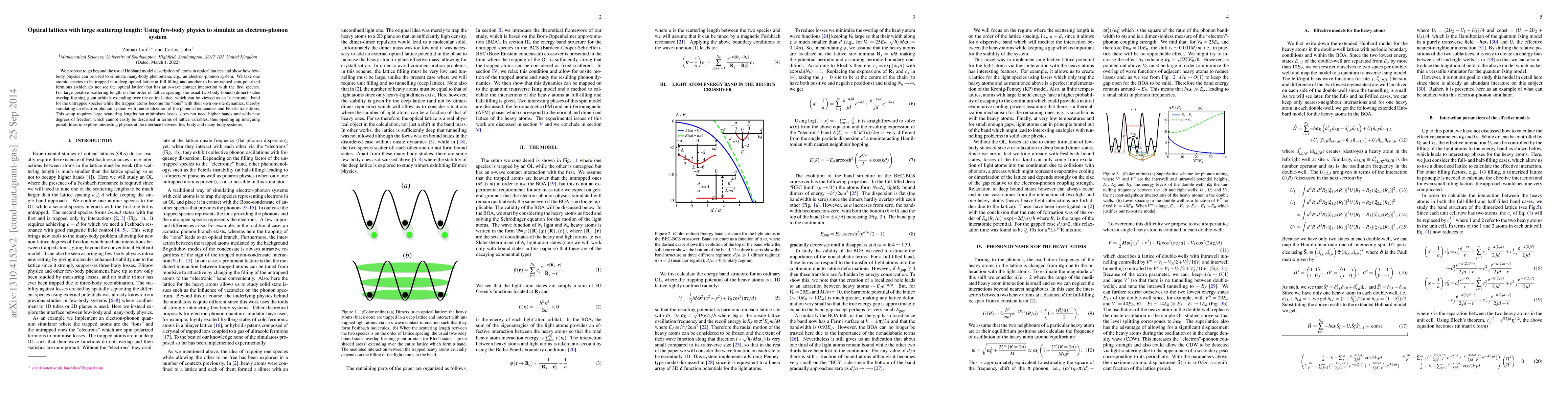 The research proposes using optical lattices with large scattering lengths to simulate an electron-phonon system via few-body physics. This setup involves trapping one atomic species in a deep optical lattice and interacting it with untrapped spin-polarized fermions. The large scattering length leads to the formation of giant orbitals, simulating an electron-phonon system with altered phonon frequencies and Peierls transitions, opening new avenues to study few-body and many-body interfaces.