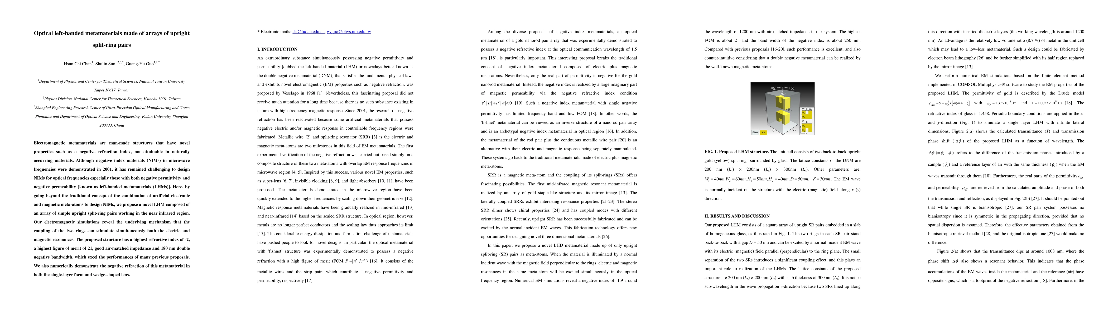 Electromagnetic metamaterials are man-made structures that have novel properties such as a negative refraction index, not attainable in naturally occurring materials. Although negative index materials (NIMs) in microwave frequencies were demonstrated in 2001, it has remained challenging to design NIMs for optical frequencies especially those with both negative permittivity and negative permeability [known as left-handed metamaterials (LHMs)]. Here, by going beyond the traditional concept of the combination of artificial electronic and magnetic meta-atoms to design NIMs, we propose a novel LHM composed of an array of simple upright split-ring pairs working in the near infrared region. Our electromagnetic simulations reveal the underlying mechanism that the coupling of the two rings can stimulate simultaneously both the electric and magnetic resonances. The proposed structure has a highest refractive index of -2, a highest figure of merit of 21, good air-matched impedance and 180 nm double negative bandwidth, which excel the performances of many previous proposals. We also numerically demonstrate the negative refraction of this metamaterial in both the single-layer form and wedge-shaped lens.