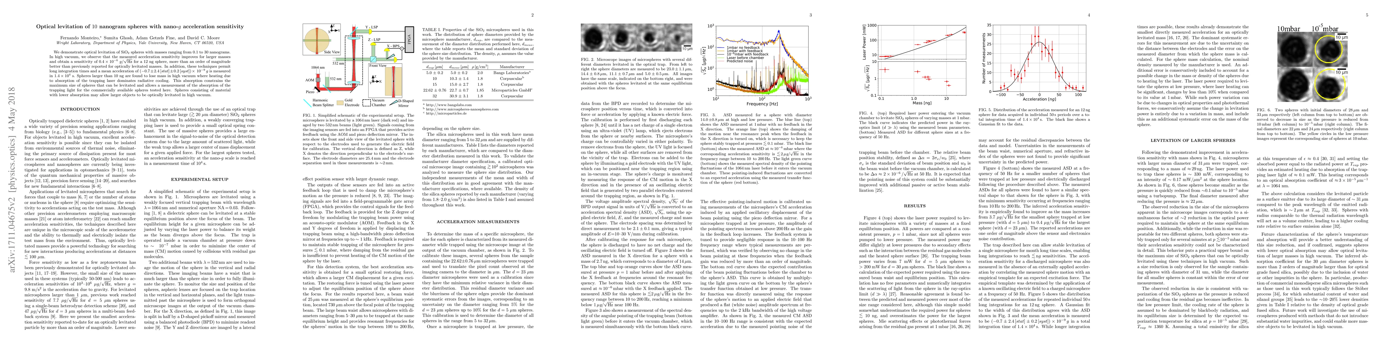 We demonstrate optical levitation of SiO$_2$ spheres with masses ranging from 0.1 to 30 nanograms. In high vacuum, we observe that the measured acceleration sensitivity improves for larger masses and obtain a sensitivity of $0.4 \times 10^{-6}\ g/\sqrt{\mathrm{Hz}}$ for a 12 ng sphere, more than an order of magnitude better than previously reported for optically levitated masses. In addition, these techniques permit long integration times and a mean acceleration of $(-0.7\pm2.4\,[stat] \pm 0.2\,[syst])\times ~ 10^{-9}\,g$ is measured in $1.4\times 10^4$~s. Spheres larger than 10~ng are found to lose mass in high vacuum where heating due to absorption of the trapping laser dominates radiative cooling. This absorption constrains the maximum size of spheres that can be levitated and allows a measurement of the absorption of the trapping light for the commercially available spheres tested here. Spheres consisting of material with lower absorption may allow larger objects to be optically levitated in high vacuum.