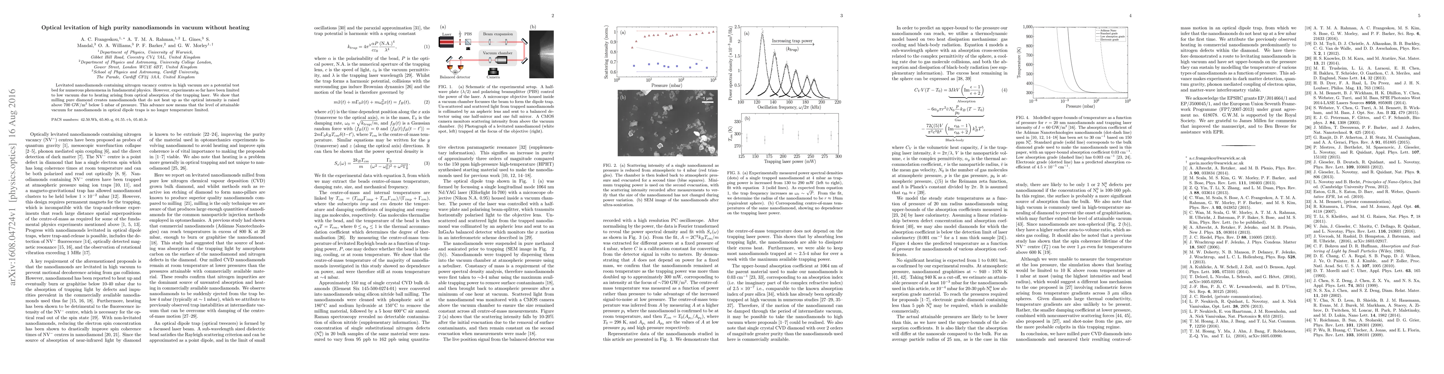 This paper demonstrates the optical levitation of high purity nanodiamonds in high vacuum without heating, overcoming previous limitations due to optical absorption. This breakthrough allows for experiments in fundamental physics using nanodiamonds in ultra-high vacuum conditions.