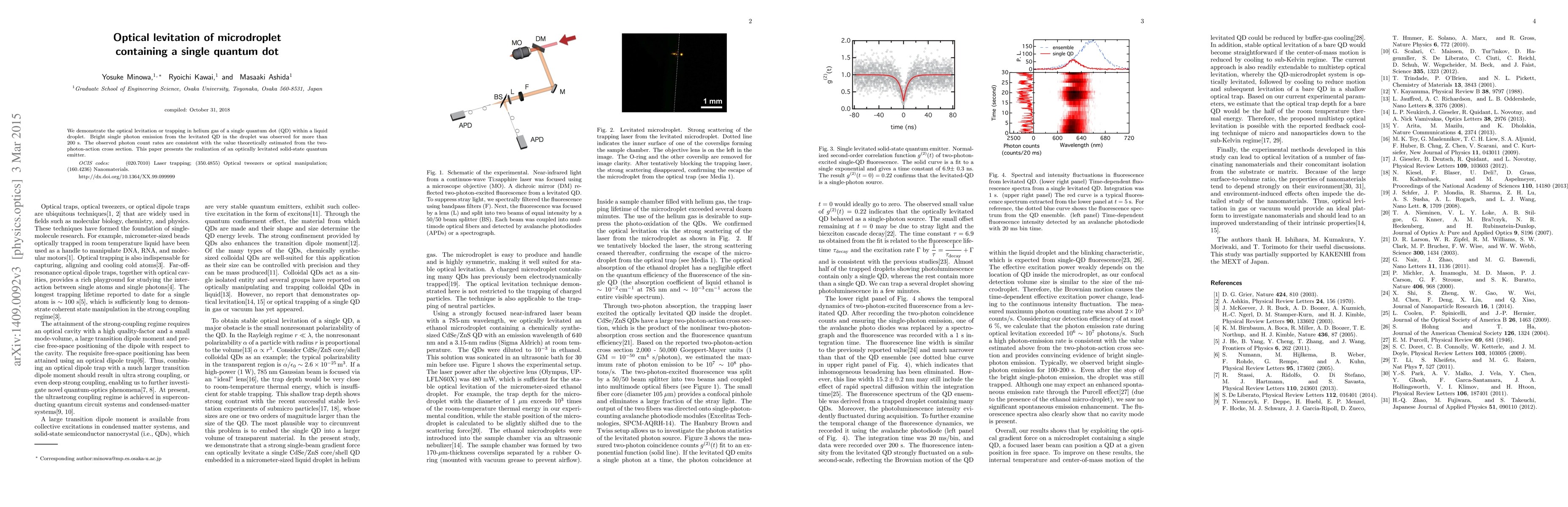We demonstrate the optical levitation or trapping in helium gas of a single quantum dot (QD) within a liquid droplet. Bright single photon emission from the levitated QD in the droplet was observed for more than 200 s. The observed photon count rates are consistent with the value theoretically estimated from the two-photon-action cross section. This paper presents the realization of an optically levitated solid-state quantum emitter. This paper was published in Optics Letters and is made available as an electronic reprint with the permission of OSA. The paper can be found at the following URL on the OSA website: https://www.opticsinfobase.org/ol/abstract.cfm?uri=ol-40-6-906. Systematic or multiple reproduction or distribution to multiple locations via electronic or other means is prohibited and is subject to penalties under law.