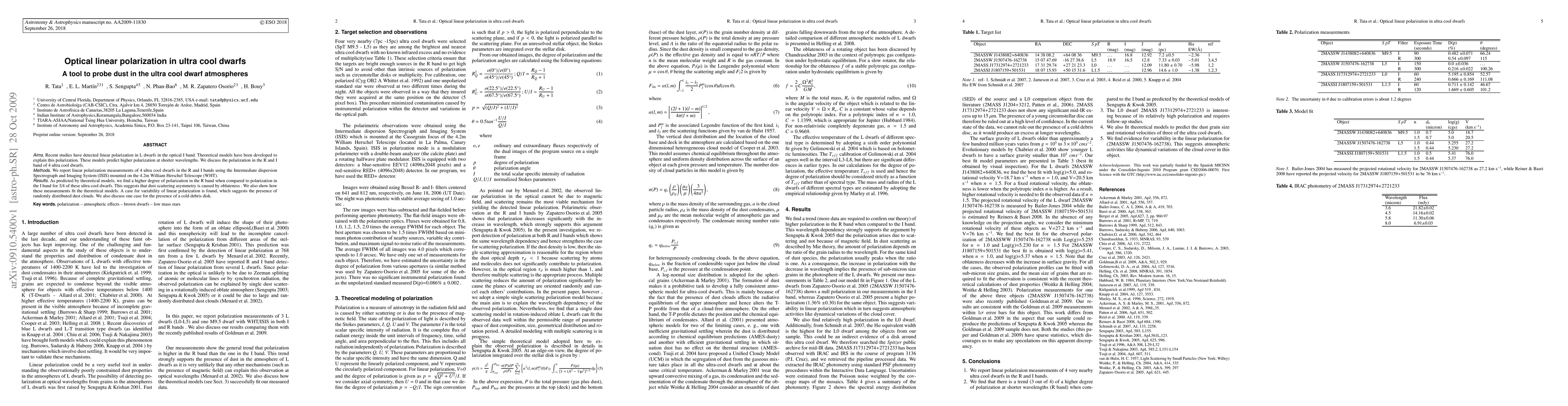Aims.Recent studies have detected linear polarization in L dwarfs in the optical I band. Theoretical models have been developed to explain this polarization. These models predict higher polarization at shorter wavelengths. We discuss the polarization in the R and I band of 4 ultra cool dwarfs. Methods.We report linear polarization measurements of 4 ultra cool dwarfs in the R and I bands using the Intermediate dispersion Spectrograph and Imaging System (ISIS) mounted on the 4.2m William Herschel Telescope (WHT). Results.As predicted by theoretical models, we find a higher degree of polarization in the R band when compared to polarization in the I band for 3/4 of these ultra cool dwarfs. This suggests that dust scattering asymmetry is caused by oblateness >.We also show how these measurements fit the theoretical models. A case for variability of linear polarization is found, which suggests the presence of randomly distributed dust clouds. We also discuss one case for the presence of a cold debris disk.