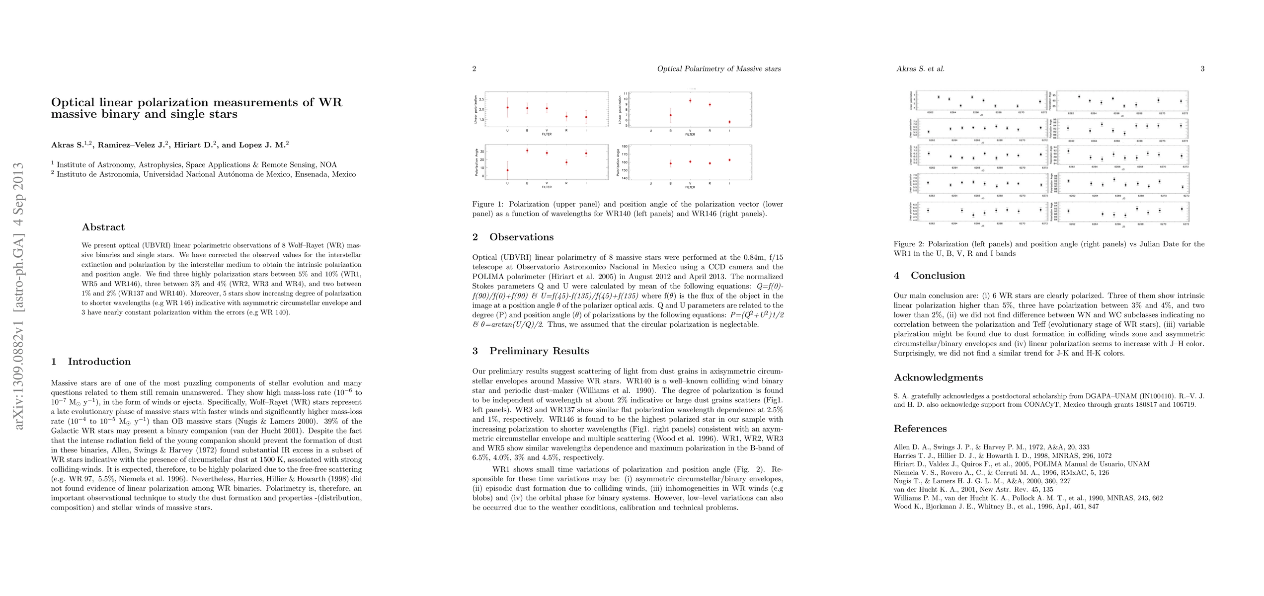 We present optical (UBVRI) linear polarimetric observations of 8 Wolf-Rayet (WR) massive binaries and single stars. We have corrected the observed values for the interstellar extinction and polarization by the interstellar medium to obtain the intrinsic polarization and position angle. We find three highly polarization stars between 5% and 10% (WR1, WR5 and WR146), three between 3% and 4% (WR2, WR3 and WR4), and two between 1% and 2% (WR137 and WR140). Moreover, 5 stars show increasing degree of polarization to shorter wavelengths (e.g WR 146) indicative with asymmetric circumstellar envelope and 3 have nearly constant polarization within the errors (e.g WR 140).