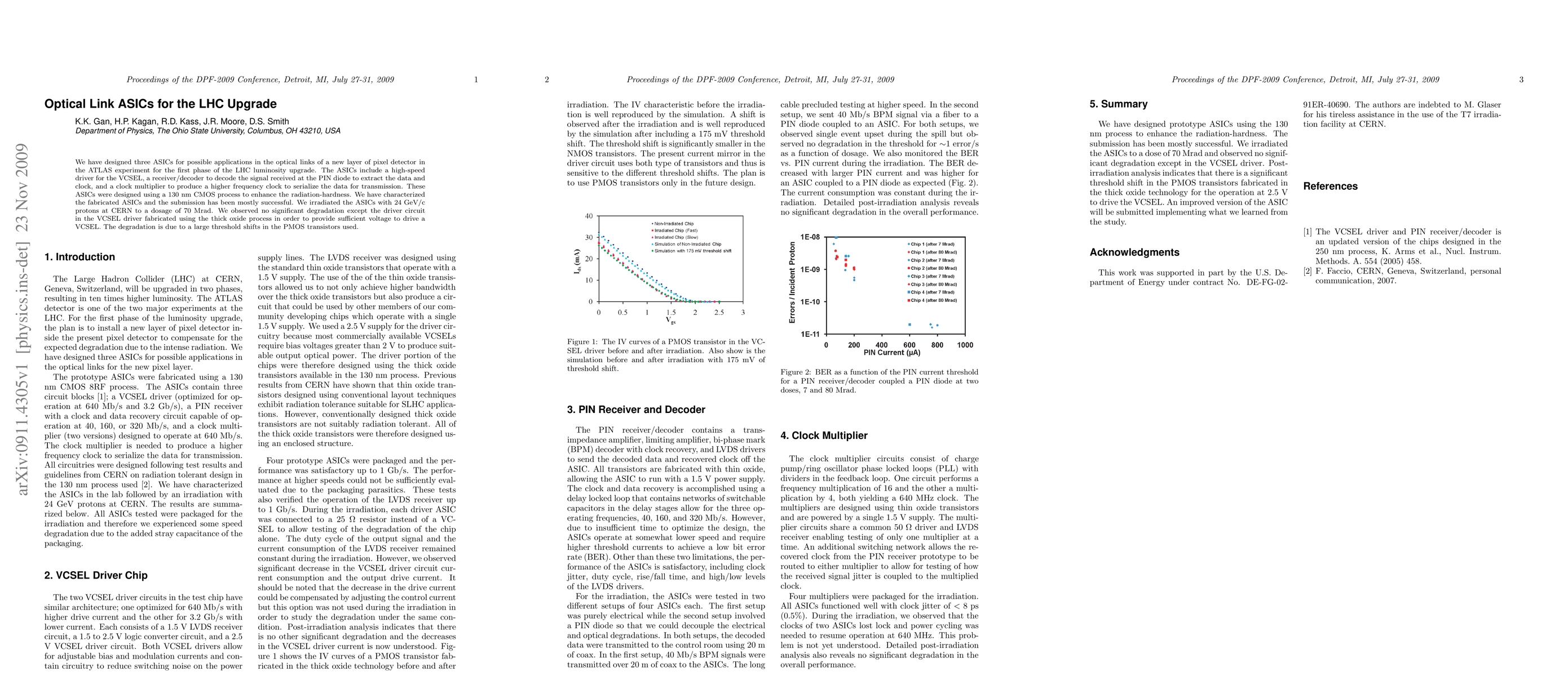 We have designed three ASICs for possible applications in the optical links of a new layer of pixel detector in the ATLAS experiment for the first phase of the LHC luminosity upgrade. The ASICs include a high-speed driver for the VCSEL, a receiver/decoder to decode the signal received at the PIN diode to extract the data and clock, and a clock multiplier to produce a higher frequency clock to serialize the data for transmission. These ASICs were designed using a 130 nm CMOS process to enhance the radiation-hardness. We have characterized the fabricated ASICs and the submission has been mostly successful. We irradiated the ASICs with 24 GeV/c protons at CERN to a dosage of 70 Mrad. We observed no significant degradation except the driver circuit in the VCSEL driver fabricated using the thick oxide process in order to provide sufficient voltage to drive a VCSEL. The degradation is due to a large threshold shifts in the PMOS transistors used.