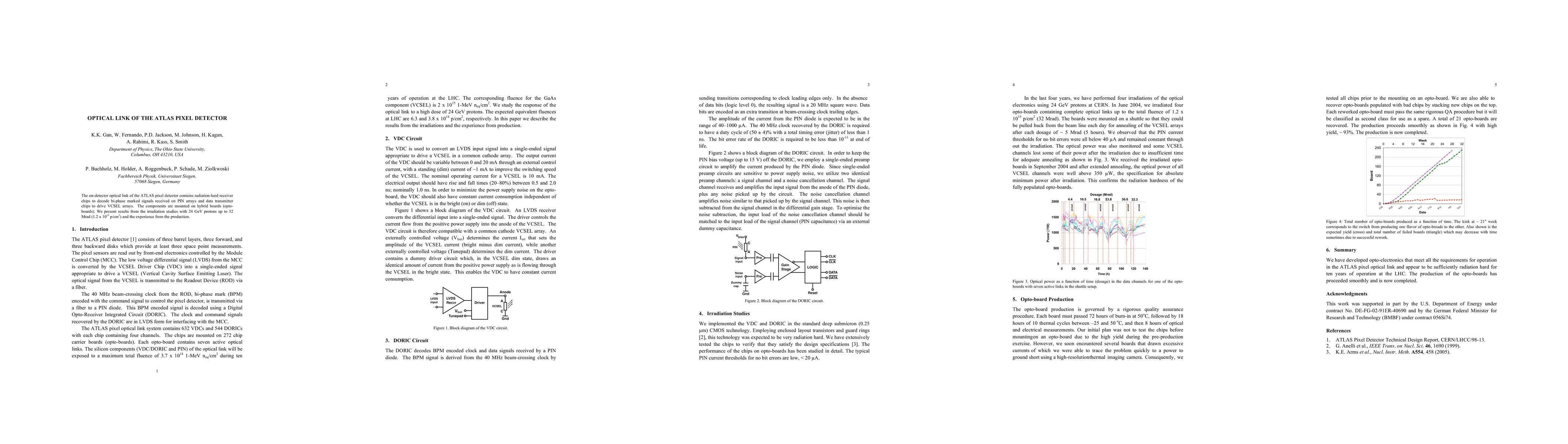 The ATLAS pixel detector's optical link features radiation-hard receiver and transmitter chips mounted on opto-boards. Irradiation studies with 24 GeV protons up to 32 Mrad demonstrated the components' durability and reliability in production.