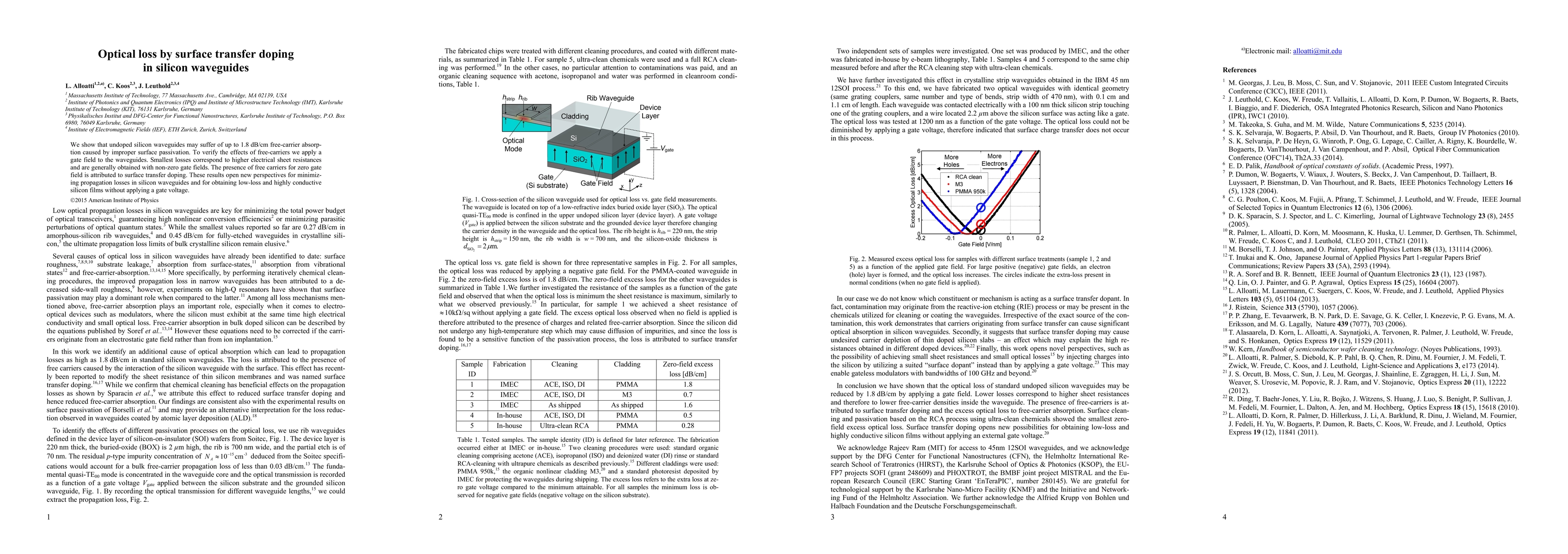 This study reveals that undoped silicon waveguides experience up to 1.8 dB/cm in optical loss due to free-carrier absorption from surface transfer doping. Applying a gate field minimizes these losses, suggesting potential for low-loss silicon waveguides and conductive films without gate voltage.