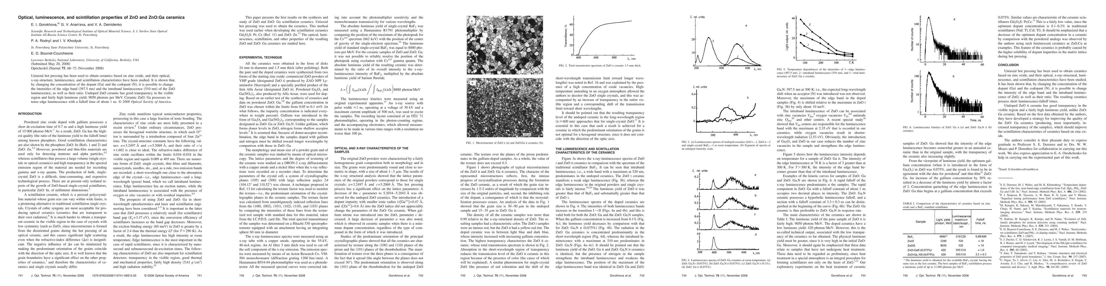 Uniaxial hot pressing has been used to obtain ceramics based on zinc oxide, and their optical, x-ray-structure, luminescence, and scintillation characteristics have been studied. It is shown that, by changing the concentration of the dopant (Ga) and the codopant (N), it is possible to change the intensities of the edge band (397.5 nm) and the intraband luminescence (510 nm) of the ZnO luminescence, as well as their ratio. Undoped ZnO ceramic has good transparency in the visible region and fairly high luminous yield: 9050 photons per MeV. Ceramic ZnO:Ga possesses intense edge luminescence with a falloff time of about 1 ns.