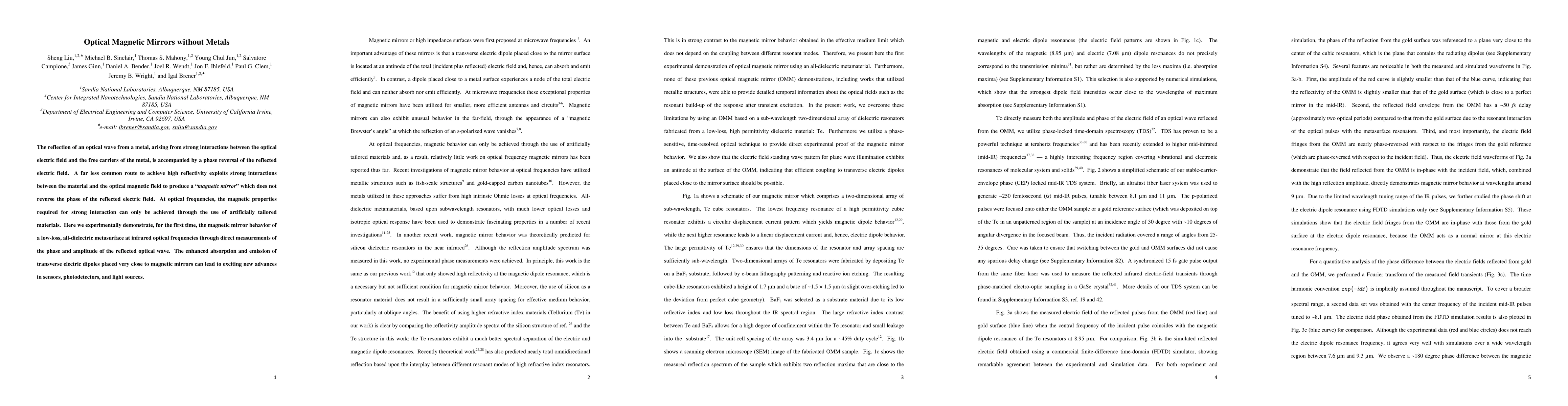 The reflection of an optical wave from a metal, arising from strong interactions between the optical electric field and the free carriers of the metal, is accompanied by a phase reversal of the reflected electric field. A far less common route to achieve high reflectivity exploits strong interactions between the material and the optical magnetic field to produce a magnetic mirror which does not reverse the phase of the reflected electric field. At optical frequencies, the magnetic properties required for strong interaction can only be achieved through the use of artificially tailored materials. Here we experimentally demonstrate, for the first time, the magnetic mirror behavior of a low-loss, all-dielectric metasurface at infrared optical frequencies through direct measurements of the phase and amplitude of the reflected optical wave. The enhanced absorption and emission of transverse electric dipoles placed very close to magnetic mirrors can lead to exciting new advances in sensors, photodetectors, and light sources.