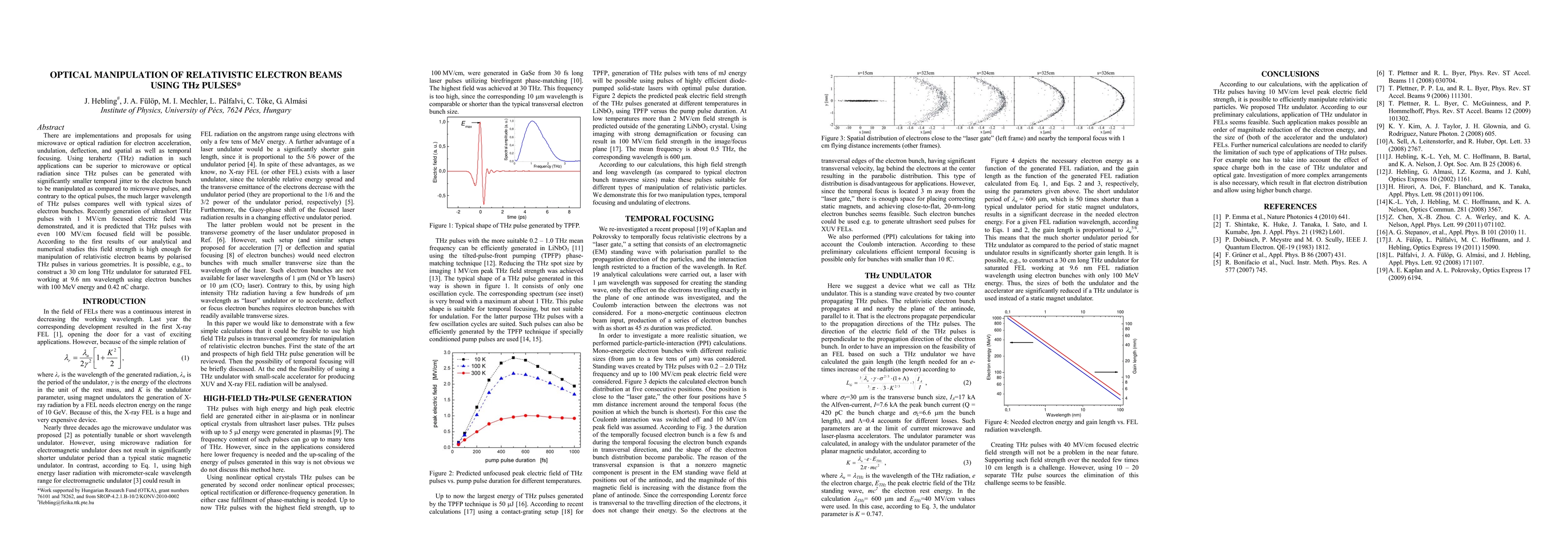 There are implementations and proposals for using microwave or optical radiation for electron acceleration, undulation, deflection, and spatial as well as temporal focusing. Using terahertz (THz) radiation in such applications can be superior to microwave or optical radiation since THz pulses can be generated with significantly smaller temporal jitter to the electron bunch to be manipulated as compared to microwave pulses, and contrary to the optical pulses, the much larger wavelength of THz pulses compares well with typical sizes of electron bunches. Recently generation of ultrashort THz pulses with 1 MV/cm focused electric field was demonstrated, and it is predicted that THz pulses with even 100 MV/cm focused field will be possible. According to the first results of our analytical and numerical studies this field strength is high enough for manipulation of relativistic electron beams by polarised THz pulses in various geometries. It is possible, e.g., to construct a 30 cm long THz undulator for saturated FEL working at 9.6 nm wavelength using electron bunches with 100 MeV energy and 0.42 nC charge.