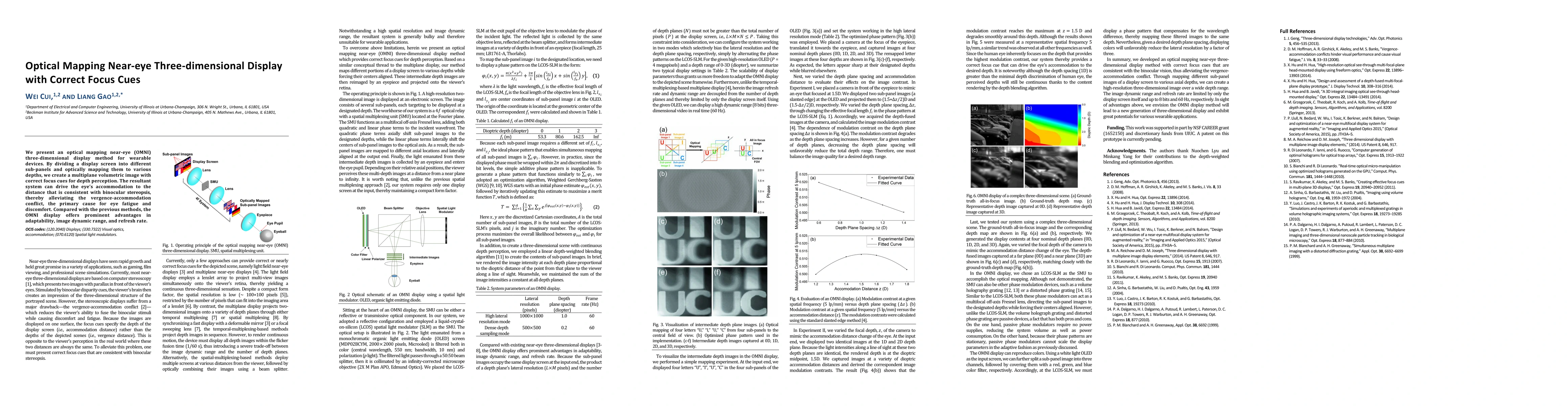 We present an optical mapping near-eye (OMNI) three-dimensional display method for wearable devices. By dividing a display screen into different sub-panels and optically mapping them to various depths, we create a multiplane volumetric image with correct focus cues for depth perception. The resultant system can drive the eye's accommodation to the distance that is consistent with binocular stereopsis, thereby alleviating the vergence-accommodation conflict, the primary cause for eye fatigue and discomfort. Compared with the previous methods, the OMNI display offers prominent advantages in adaptability, image dynamic range, and refresh rate.