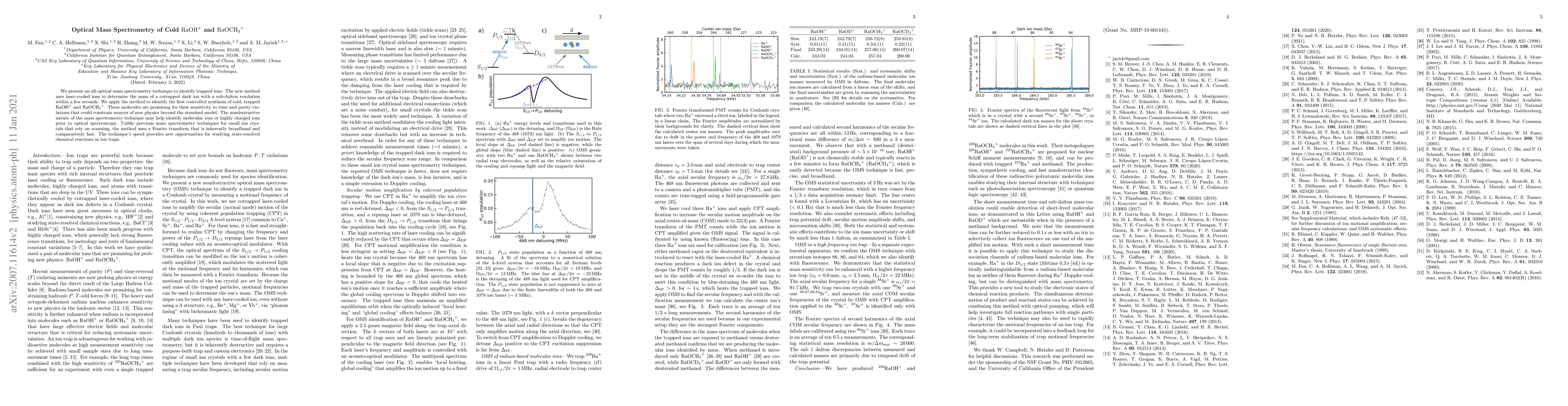 We present an all-optical mass spectrometry technique to identify trapped ions. The new method uses laser-cooled ions to determine the mass of a cotrapped dark ion with a sub-dalton resolution within a few seconds. We apply the method to identify the first controlled synthesis of cold, trapped $\mathrm{RaOH}^+$ and ${\mathrm{RaOCH}_3}^+$. These molecules are promising for their sensitivity to time and parity violations that could constrain sources of new physics beyond the standard model. The nondestructive nature of the mass spectrometry technique may help identify molecular ions or highly charged ions prior to optical spectroscopy. Unlike previous mass spectrometry techniques for small ion crystals that rely on scanning, the method uses a Fourier transform which is inherently broadband and comparatively fast. The technique's speed provides new opportunities for studying state-resolved chemical reactions in ion traps.