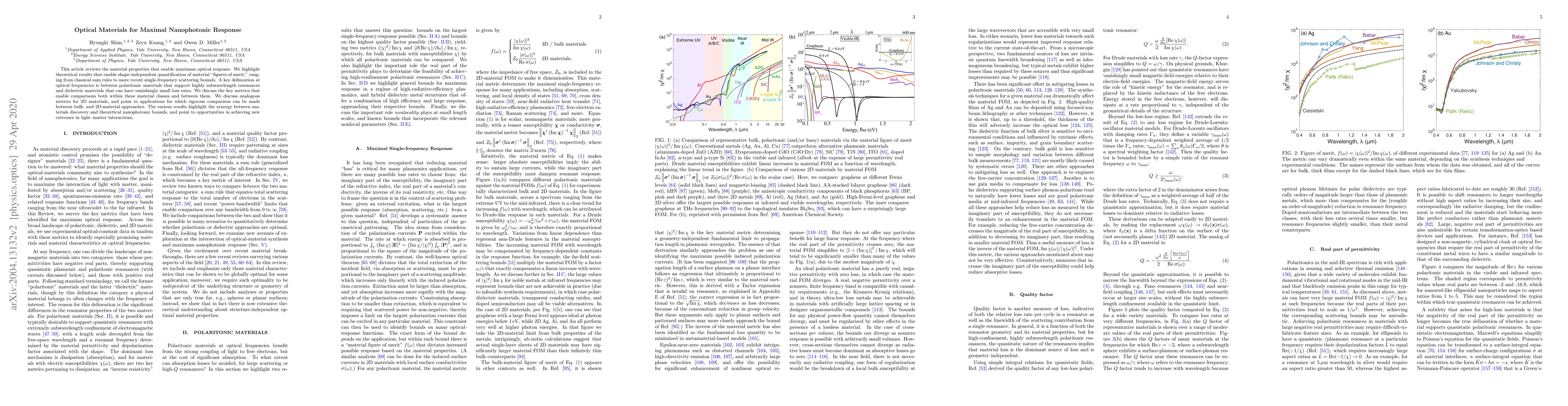 This paper reviews material properties for optimal optical response, presenting theoretical results for shape-independent material evaluation. It distinguishes between polaritonic and dielectric materials, discussing key metrics for comparison. The study also explores 2D materials and suggests opportunities for advancing light-matter interactions.