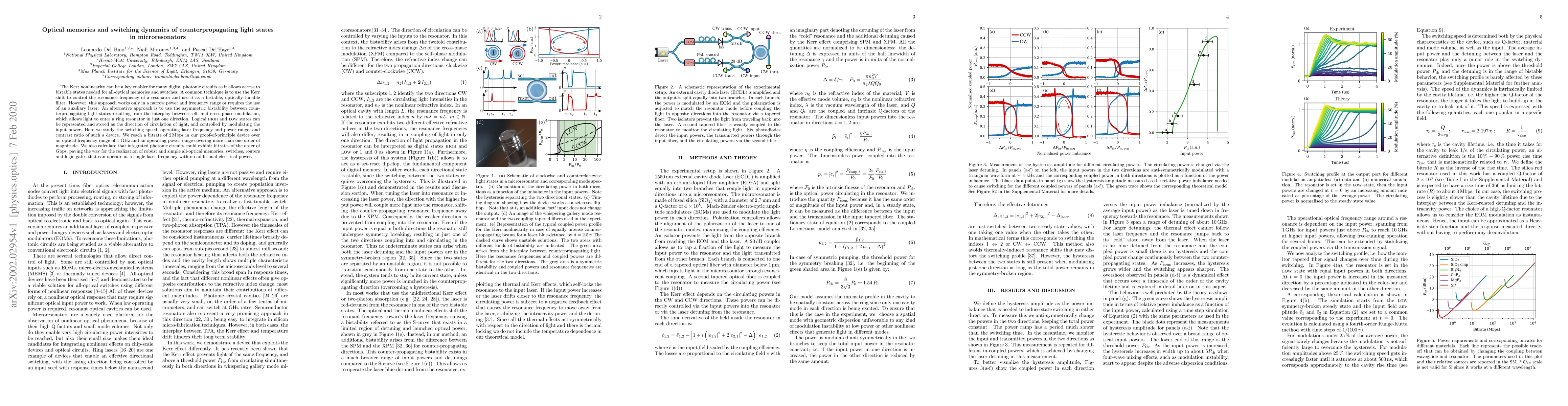 This research explores the use of counterpropagating light states in microresonators for all-optical memories and switches, achieving a bitrate of 2 Mbps over a 1 GHz optical frequency range and a wide power range. The methodology leverages self- and cross-phase modulation for asymmetric bistability, suggesting potential for Gbps bitrates in integrated photonic circuits with a single laser frequency and no electrical power.