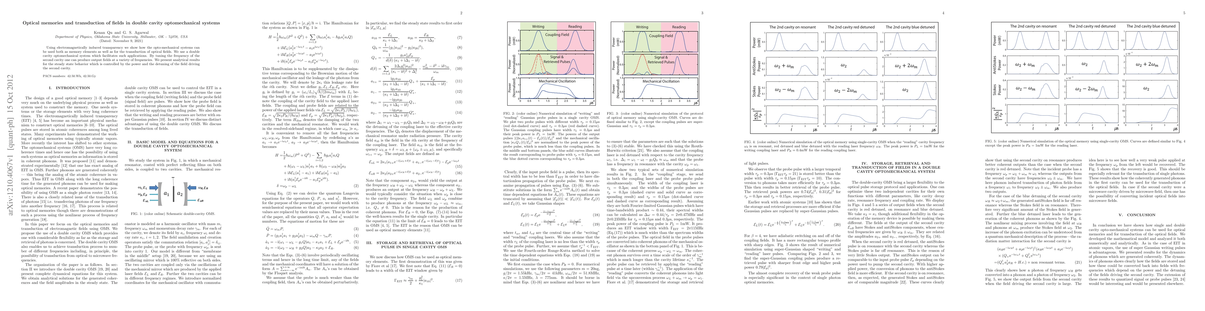 This paper demonstrates the use of double cavity optomechanical systems for optical memory and field transduction via electromagnetically induced transparency. Analytical results show how tuning the second cavity's frequency enables the production of output fields at various frequencies, controlled by the driving field's power and detuning.