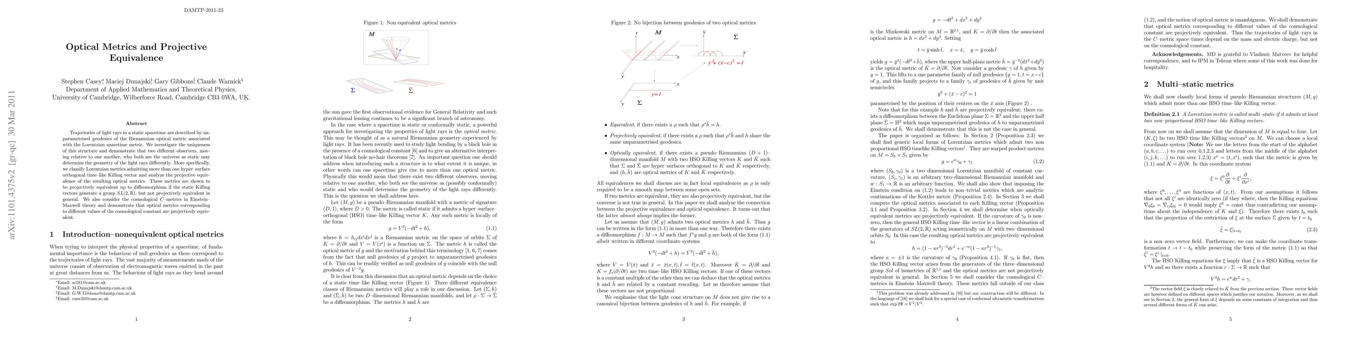 Trajectories of light rays in a static spacetime are described by unparametrised geodesics of the Riemannian optical metric associated with the Lorentzian spacetime metric. We investigate the uniqueness of this structure and demonstrate that two different observers, moving relative to one another, who both see the universe as static may determine the geometry of the light rays differently. More specifically, we classify Lorentzian metrics admitting more than one hyper--surface orthogonal time--like Killing vector and analyze the projective equivalence of the resulting optical metrics. These metrics are shown to be projectively equivalent up to diffeomorphism if the static Killing vectors generate a group $SL(2, \R)$, but not projectively equivalent in general. We also consider the cosmological $C$--metrics in Einstein--Maxwell theory and demonstrate that optical metrics corresponding to different values of the cosmological constant are projectively equivalent.
