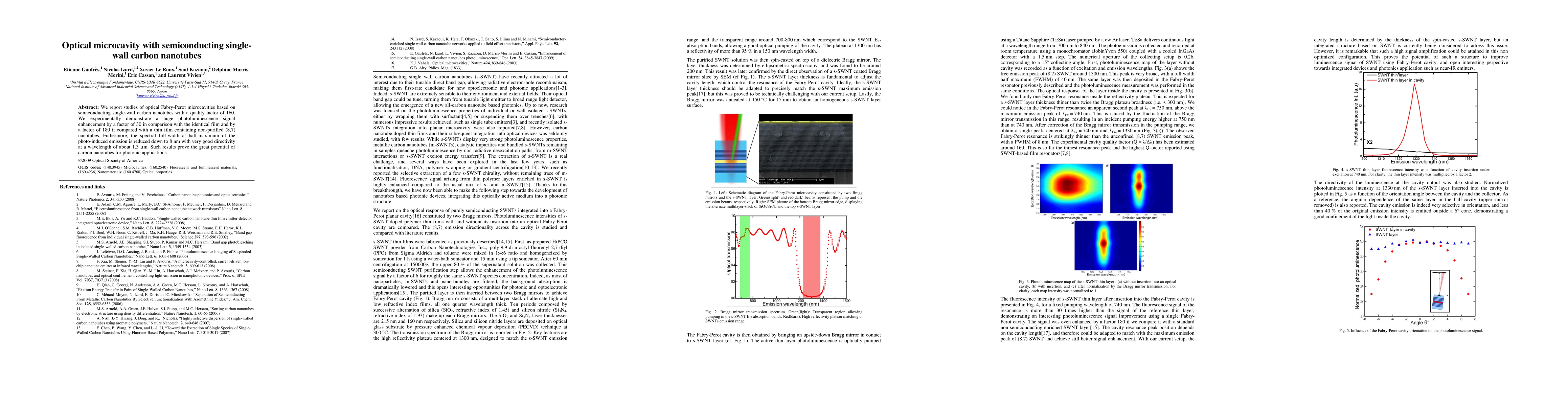 Research demonstrates optical microcavities using semiconducting single-wall carbon nanotubes achieving a quality factor of 160 and a 30-fold enhancement in photoluminescence signal compared to identical films, highlighting their potential for photonic applications.