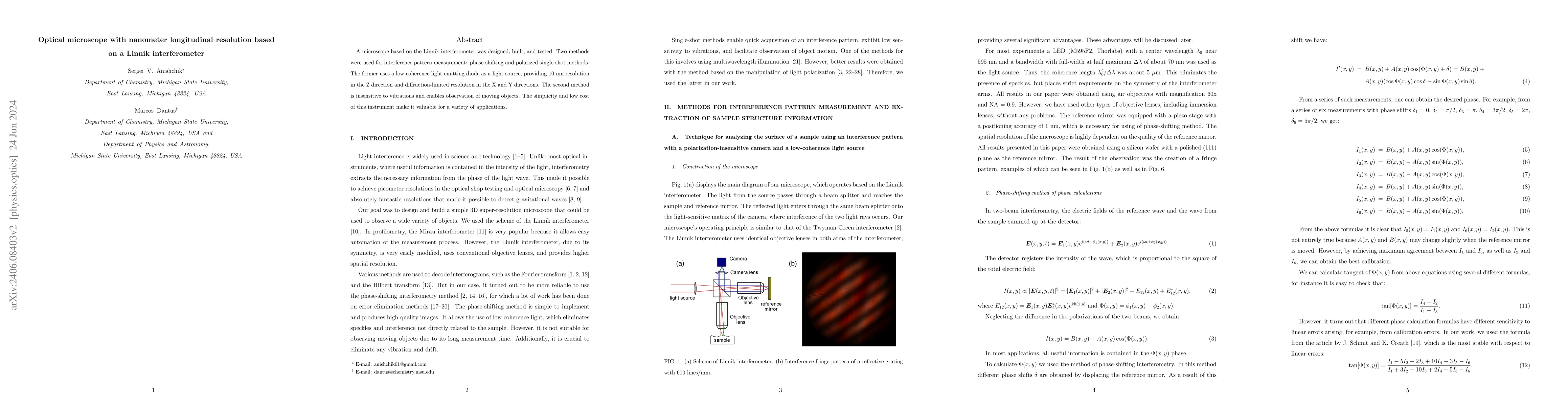 A Linnik interferometer-based optical microscope achieves nanometer longitudinal resolution (10 nm) and diffraction-limited lateral resolution, employing phase-shifting and polarized single-shot methods for interference pattern measurement, suitable for various applications due to its simplicity and low cost. The polarized method also allows observation of moving objects without sensitivity to vibrations.