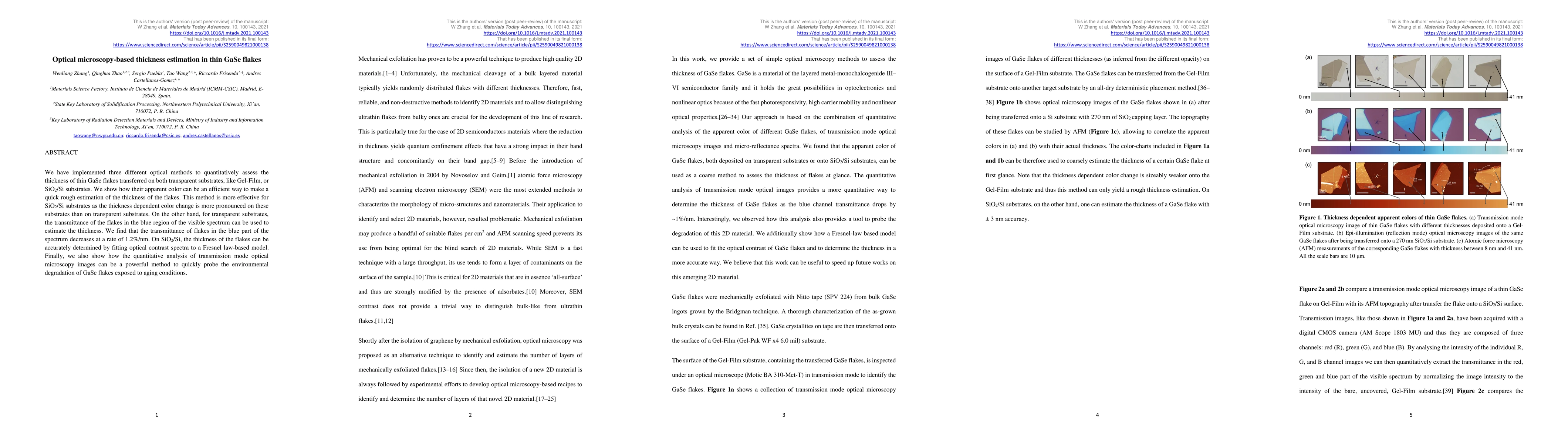 This study presents three optical methods for estimating the thickness of thin GaSe flakes, including color-based estimation on SiO2/Si substrates and blue spectral transmittance on transparent substrates. The research also demonstrates the use of optical microscopy for assessing environmental degradation of GaSe flakes.
