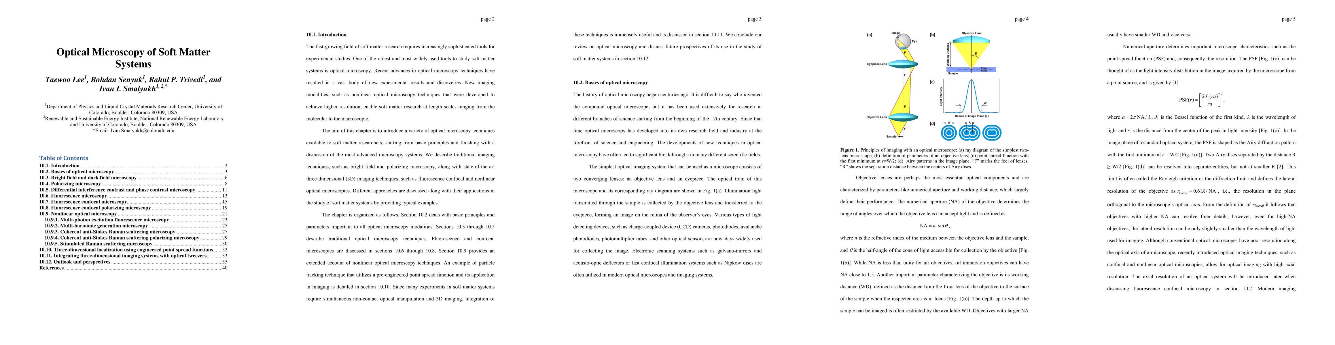 The fast-growing field of soft matter research requires increasingly sophisticated tools for experimental studies. One of the oldest and most widely used tools to study soft matter systems is optical microscopy. Recent advances in optical microscopy techniques have resulted in a vast body of new experimental results and discoveries. New imaging modalities, such as nonlinear optical microscopy techniques that were developed to achieve higher resolution, enable soft matter research at length scales ranging from the molecular to the macroscopic. The aim of this chapter is to introduce a variety of optical microscopy techniques available to soft matter researchers, starting from basic principles and finishing with a discussion of the most advanced microscopy systems. We describe traditional imaging techniques, such as bright field and polarizing microscopy, along with state-of-the-art three-dimensional (3D) imaging techniques, such as fluorescence confocal and nonlinear optical microscopies. Different approaches are discussed along with their applications in the study of soft matter systems by providing typical examples.